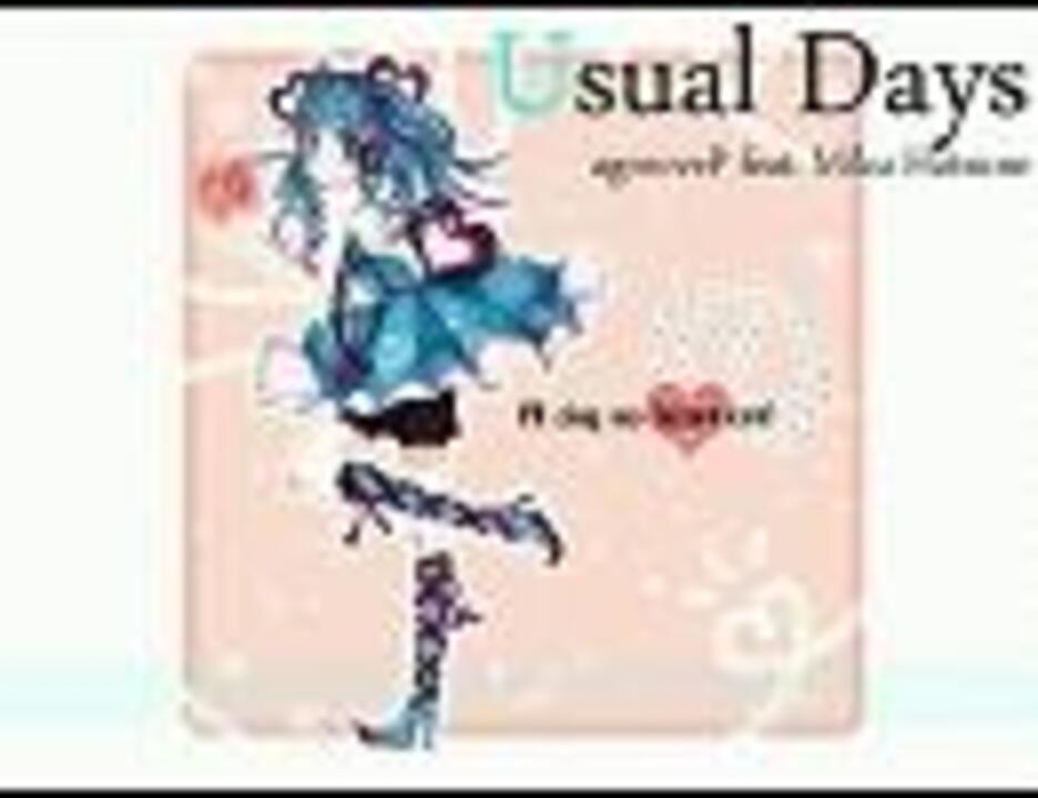 こんにちは。agroovePです。<br />卒論から解放された勢いで1曲作っちゃいました。ポップな感じになっているといいなと思います。<br />かわいいイラストはピアプロからどうぇるさんのものを使用させていただきました。ありがとうございます。<br /><br />作詞作曲:agrooveP<br />イラスト:どうぇるさん(<a href="http://piapro.jp/t/Eaf_)" target="_blank" rel="noopener nofollow">http://piapro.jp/t/Eaf_)</a><br /><br />なんと憧れのKTG(チーターガールP)さんがリミックスしてくれました!爽快感あふれるラテンハウスになっております。めちゃくちゃ素敵です。<br />Usual Days (KTG Siesta Mix) → <a href="https://www.nicovideo.jp/watch/sm17037052" class="watch">sm17037052</a><br /><br />イラストのどうぇるさんの名前を間違えて表記していました…。大変申し訳ありません。コメントで指摘していただきありがとうございます。