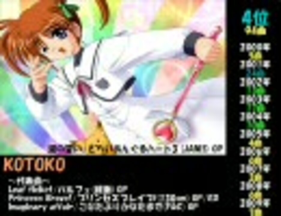 この動画はspring efemeral様(<a href="http://d.hatena.ne.jp/efemeral/)" target="_blank" rel="noopener nofollow">http://d.hatena.ne.jp/efemeral/)</a>。そのデータ元であるBANDiT の隠れ家様(<a href="http://www.alchemics.co.jp/users/bandit/)を利用し2000年~2009年の間にエロゲソングを最も多く歌った歌姫をランキング形式で紹介しております" target="_blank" rel="noopener nofollow">http://www.alchemics.co.jp/users/bandit/)を利用し2000年~2009年の間にエロゲソングを最も多く歌った歌姫をランキング形式で紹介しております</a>。キャラクターソング等も集計対象であるため声優の方々もランクインしております。1999年以前と2010年は集計対象外ですご注意ください。素材の多さに心が折れそうでした。通常営業はそのうちに再開します。<a href="https://www.nicovideo.jp/mylist/8192915" target="_blank" rel="noopener">mylist/8192915</a>