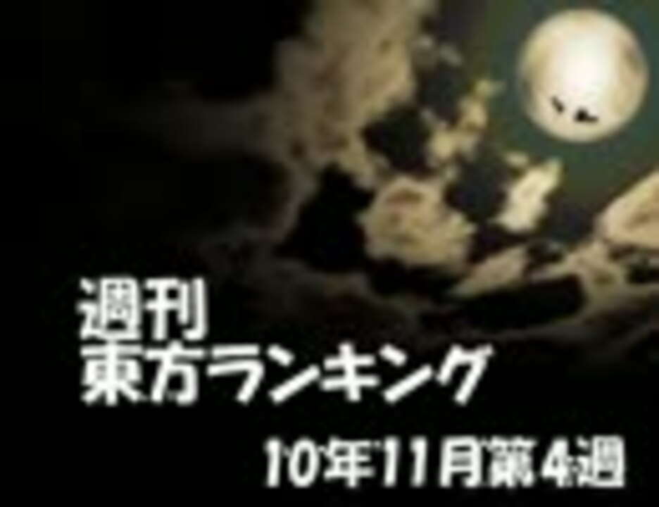 今週のプレイリスト[<a href="https://www.nicovideo.jp/mylist/22358601" target="_blank" rel="noopener">mylist/22358601</a>] ☆週刊東方ランキング一覧[<a href="https://www.nicovideo.jp/mylist/10450068" target="_blank" rel="noopener">mylist/10450068</a>]<br />[<a href="https://www.nicovideo.jp/watch/sm12810172" class="watch">sm12810172</a>]←先週 次週→[<a href="https://www.nicovideo.jp/watch/sm12942967" class="watch">sm12942967</a>]<br /><br />【集計期間】 11/20(土) 0:00 - 11/27(土) 0:00<br />【集計方法】 ポイント数 = マイリスト数 + (再生数 ÷ 20)<br />【集計対象】 東方タグがついている作品、タイトルに東方が含まれる作品<br /><br />掲示板 → <a href="http://www2.atchs.jp/toho/" target="_blank" rel="noopener nofollow">http://www2.atchs.jp/toho/</a><br />データwiki → <a href="http://www39.atwiki.jp/tohoranking" target="_blank" rel="noopener nofollow">http://www39.atwiki.jp/tohoranking</a><br />エンドカード募集中!→ <a href="http://www5.atpages.jp/tohonico/joyful/" target="_blank" rel="noopener nofollow">http://www5.atpages.jp/tohonico/joyful/</a><br /><br />東方系ランキングリンク<br />・【MMD】 東方MMD Ranking 10月 → <a href="https://www.nicovideo.jp/watch/sm12642103" class="watch">sm12642103</a><br />・月刊東方ランキング 10年10月 → <a href="https://www.nicovideo.jp/watch/sm12731449" class="watch">sm12731449</a><br />・月刊新作東方手書きランキング 2010年10月号 → <a href="https://www.nicovideo.jp/watch/sm12784222" class="watch">sm12784222</a><br />・月刊東方自作アレンジランキング 10年10月号 → <a href="https://www.nicovideo.jp/watch/sm12824974" class="watch">sm12824974</a>