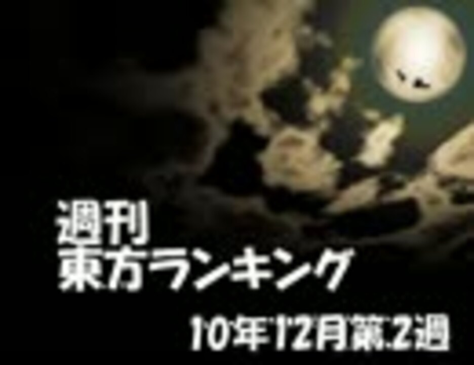 今週のプレイリスト[<a href="https://www.nicovideo.jp/mylist/22558282" target="_blank" rel="noopener">mylist/22558282</a>] ☆週刊東方ランキング一覧[<a href="https://www.nicovideo.jp/mylist/10450068" target="_blank" rel="noopener">mylist/10450068</a>]<br />[<a href="https://www.nicovideo.jp/watch/sm12942967" class="watch">sm12942967</a>]←先週 次週→[<a href="https://www.nicovideo.jp/watch/sm13065257" class="watch">sm13065257</a>]<br /><br />【集計期間】 12/4(土) 0:00 - 12/11(土) 0:00<br />【集計方法】 ポイント数 = マイリスト数 + (再生数 ÷ 20)<br />【集計対象】 東方タグがついている作品、タイトルに東方が含まれる作品<br /><br />掲示板 → <a href="http://www2.atchs.jp/toho/" target="_blank" rel="noopener nofollow">http://www2.atchs.jp/toho/</a><br />データwiki → <a href="http://www39.atwiki.jp/tohoranking" target="_blank" rel="noopener nofollow">http://www39.atwiki.jp/tohoranking</a><br />エンドカード募集中!→ <a href="http://www5.atpages.jp/tohonico/joyful/" target="_blank" rel="noopener nofollow">http://www5.atpages.jp/tohonico/joyful/</a><br />