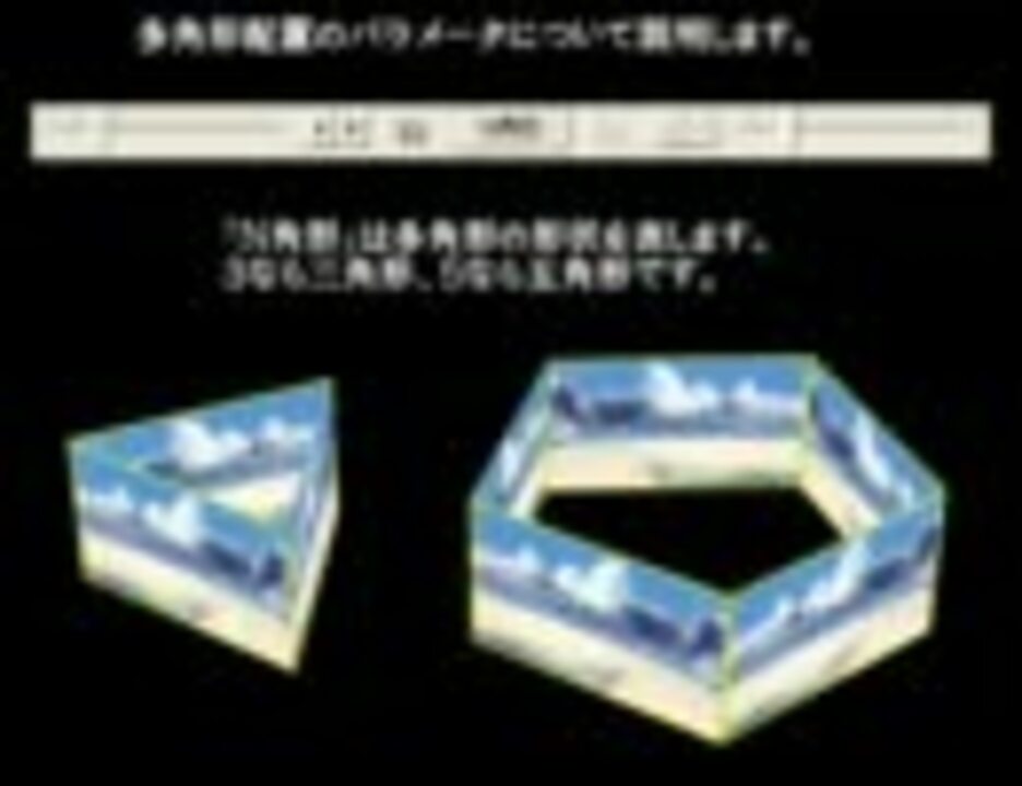 AviUtl拡張編集プラグインのアニメーション効果フィルタに「サイズ基準多角形配置」を追加するluaスクリプトです。<br />名前の通り、1つのオブジェクトを多角形状に配置して制御するためのものです。<br /><br />2011.2.9追記<br /> 機能追加などを行なった新しいスクリプトを<a href="https://www.nicovideo.jp/watch/sm13546528" class="watch">sm13546528</a>で公開しましたので、そちらを使うようにして下さい。<br /><br />■使用したツールのバージョン<br /> AviUtl 0.99i8 + 拡張編集プラグイン0.87d<br /><br />■参考 ・AviUtl愛好会コミュ(co556462) <br /> ・さつきさんのユーザ記事 <a href="http://dic.nicovideo.jp/u/2787743" target="_blank" rel="noopener nofollow">http://dic.nicovideo.jp/u/2787743</a> <br /><br /><br />この動画で説明したスクリプトファイル(古いので非推奨)→ <a href="http://www1.axfc.net/uploader/File/so/57949.zip" target="_blank" rel="noopener nofollow">http://www1.axfc.net/uploader/File/so/57949.zip</a> <br /><br />ちょっと違うけど似たようなことをNiVE2でやったもの→ <a href="https://www.nicovideo.jp/watch/sm13130001" class="watch">sm13130001</a>