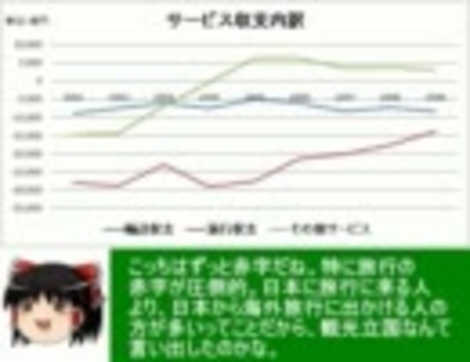 企業や家計だと赤字より黒字の方がいいに決まってるんですが、国際収支だとはっきり言って微妙です<br /><br />BGM TVアニメ「とある科学の超電磁砲」より<br />・風紀委員(ジャッジメント)の活動<br />・常盤台中学校<br />・これでいいんですの?<br /><br />参考サイト<br />新世紀のビッグブラザーへ blog <a href="http://ameblo.jp/takaakimitsuhashi/" target="_blank" rel="noopener nofollow">http://ameblo.jp/takaakimitsuhashi/</a><br />代表戸締役 ◆jJEom8Ii3Eの妄言 <a href="http://blogs.yahoo.co.jp/daitojimari" target="_blank" rel="noopener nofollow">http://blogs.yahoo.co.jp/daitojimari</a><br />広宮孝信の反「国家破産」論 ブログ <a href="http://grandpalais1975.blog104.fc2.com/" target="_blank" rel="noopener nofollow">http://grandpalais1975.blog104.fc2.com/</a><br /><br />制作物<br /> 政治系MAD動画→<a href="https://www.nicovideo.jp/mylist/17279420" target="_blank" rel="noopener">mylist/17279420</a><br /> 経済講座シリーズ→<a href="https://www.nicovideo.jp/mylist/19534280" target="_blank" rel="noopener">mylist/19534280</a><br /> 政治系以外の動画→<a href="https://www.nicovideo.jp/mylist/22564233" target="_blank" rel="noopener">mylist/22564233</a><br /><br />前回「日本の貿易収支」<a href="https://www.nicovideo.jp/watch/sm13382756" class="watch">sm13382756</a><br />次回「日本の国際収支」<a href="https://www.nicovideo.jp/watch/sm13560447" class="watch">sm13560447</a>