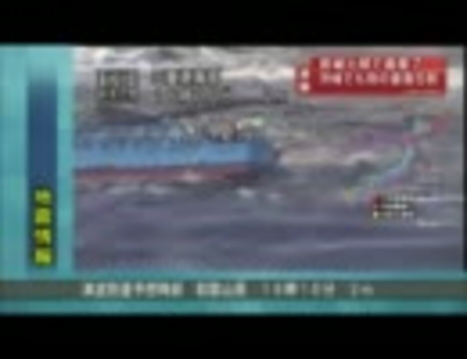 人の乗った船が津波で左右に揺れてる 乗員の身長と比べる限り、2m以上も上下に揺れてるのが分かる 船が左右に揺れてるので、甲板は40度くらいの斜めになってる 鉄柵に素手でしがみ付いてる乗員が見える 落ちれば絶対に助からない
