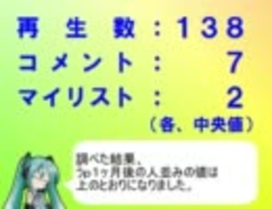 ・底辺制作者をこじらせたうp主が、人並みの値を知りたくて調べてみました。<br />・抽出調査なので、実態と異なる場合があります。ご了承ください。<br /> さらに、約6万と言いつつ実際は5万9千データですスミマセン。m(_ _)m<br />・<font color="red">(New!) </font>続編作りました!うp1年後の実態 <a href="https://www.nicovideo.jp/watch/sm18166825" class="watch">sm18166825</a><br /><br />・動画作成に、笛の踊りPさんの「六月の底辺」(<a href="https://www.nicovideo.jp/watch/sm14405855" class="watch">sm14405855</a>)という曲、およびRip Sync2とさなり様のイラストを<br /> 使わせて頂きました。どうもありがとうございました!<br />・前:タグベスト50 <a href="https://www.nicovideo.jp/watch/sm14805149" class="watch">sm14805149</a> 次:タグ分析ツール <a href="https://www.nicovideo.jp/watch/sm16777562" class="watch">sm16777562</a> 統計とかリスト <a href="https://www.nicovideo.jp/mylist/25931559" target="_blank" rel="noopener">mylist/25931559</a><br /><br />(追記)<br />ゆっくりラジオ日記様、広告どうもありがとうございました!m(_ _)m<br />