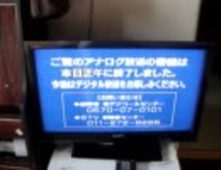 アナログ終了<br />地上デジタルの時代へ<br /><br /><br /> ┼╂┼<br /> ∩_┃_∩<br /> | ノ ヽ<br /> / ● ● |<br /> | ( _●_) ミ<br /> 彡、 |∪| 、`\<br /> / __ ヽノ /´,> )<br /> (___) / (_/<br /> | /<br /> | /\ \<br /> | / ) )<br /> ∪ ( \<br /> \_)<br /><br />2011年7月24日正午無事絶滅<br /><br /><br />