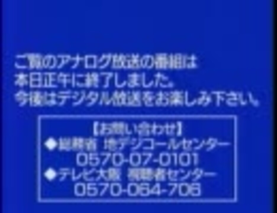 2011年7月24日 正午にアナログ放送が終了しました。<br />そのもようをテレビ大阪で録画しました。<br />どうぞ~<br /><br />追記<br />まとめに使ってもらえました。ありがとうございます。→<a href="https://www.nicovideo.jp/watch/sm15107201" class="watch">sm15107201</a>