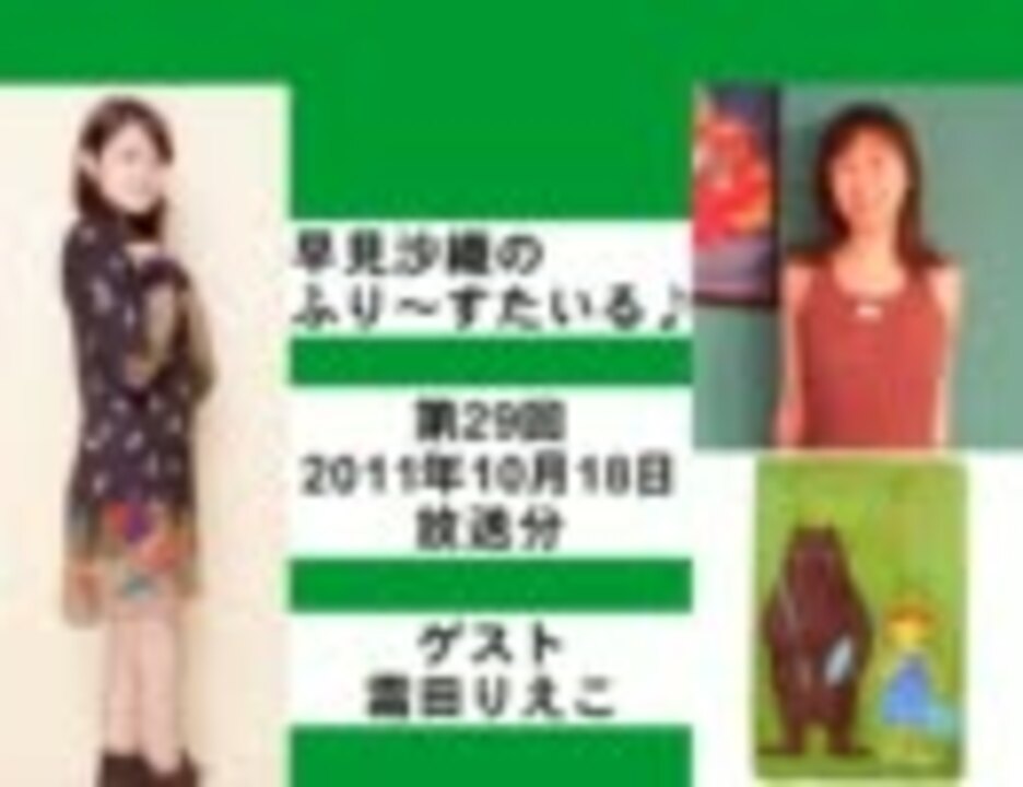 2011.10.18放送分 毎週火曜日21:30~22:00放送 【再放送】毎週水曜日9:30~10:00<br />パーソナリティ:早見沙織<br />構成作家:ふかわげんき<br />プロデューサー:門馬史織(通称:もんちゃん)<br />番組公式サイト:<a href="http://www.facebook.com/frst.joqr" target="_blank" rel="noopener nofollow">http://www.facebook.com/frst.joqr</a><br />番組へのメール:frst@joqr.net<br /><br />ゲスト:霜田りえこ(イラストレーター、絵本「クマヤマダさんと私」著者)<br />Moon company's works:<a href="http://mooncompan.exblog.jp/" target="_blank" rel="noopener nofollow">http://mooncompan.exblog.jp/</a><br />クマヤマダイアリー:<a href="http://kumayamada.jugem.jp/" target="_blank" rel="noopener nofollow">http://kumayamada.jugem.jp/</a><br /><br />今回は予想に反して面白かったです。特に早見さんの朗読の破壊力はヤバイです。<br />この感動が少しでも伝わるよう画像頑張りました。<br />■2011年10月19日追記■<br />コメント見て思いました。A&Gで早見さんの朗読をCD化しませんか?買います!<br /><br />他の放送分はこちら→ <a href="https://www.nicovideo.jp/mylist/25590232" target="_blank" rel="noopener">mylist/25590232</a>