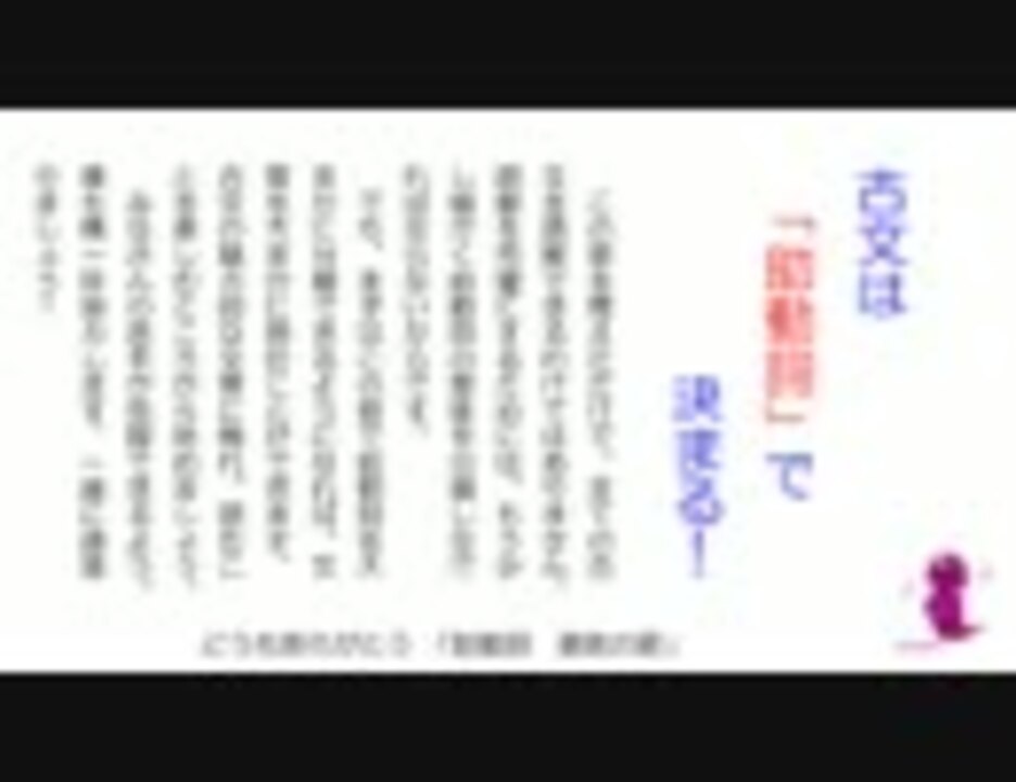 <b>※この動画は、大学受験をひかえた高校生向けの動画です。</b><br /><br />高校の古文で最もつまずきやすい助動詞の意味と用法を覚えるための覚え歌です<br /><br />ただ言葉と意味を付きあわせて覚えようとしてもなかなか覚えられないものですが<br />みなさんもよく聞く歌なら歌詞を見なくても歌えると思います。<br />言葉を覚えようと思ったら、こういう覚え歌を使うのはすごく効果的です。<br />古文が苦手な方、ぜひ挑戦してみてください。<br /><br />原曲は、さだまさしさんの「雨やどり」です。(<a href="https://www.nicovideo.jp/watch/sm483586" class="watch">sm483586</a>)<br />とても素敵な曲なので、ご存じない方はこの機会にぜひ聴いてみてください。<br /><br /><br />中学、高校生向けに、無料で個別指導の依頼を受け付けています。<br /><a href="http://hamikkuri.tumblr.com/teaching" target="_blank" rel="noopener nofollow">http://hamikkuri.tumblr.com/teaching</a>