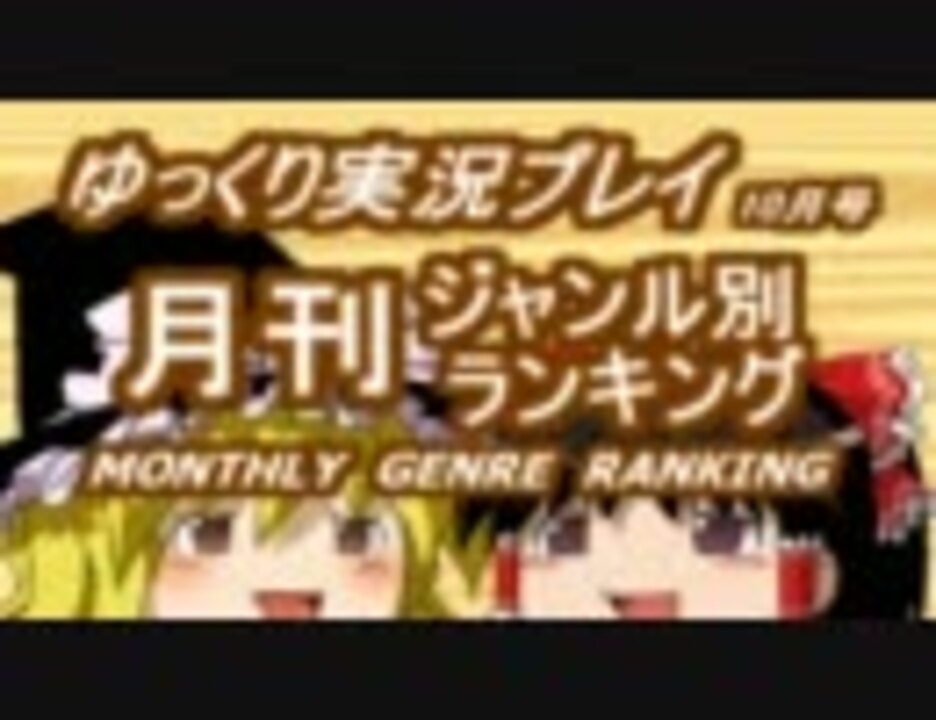 ●集計方法:再生数+コメント数+マイリスト数×20で総合ポイントを算出<br />●集計期間:10月1日0時~10月31日23時59分まで<br />●集計対象:1.集計期間内に投稿された『ゆっくり実況プレイ』タグがついたゲームカテゴリーの作品。2.同じ投稿者さんの作品&シリーズが複数ランクインした場合、総合ポイントが最も高い1本を採用。3.R18カテゴリーのタグが付いた作品は集計を控えました。<br />※10月号の作品一覧です連続再生にどうぞ→<a href="https://www.nicovideo.jp/mylist/28480941" target="_blank" rel="noopener">mylist/28480941</a>、<br />週刊ゆっくり第26号→<a href="https://www.nicovideo.jp/watch/sm16165763" class="watch">sm16165763</a>、月ジャンと毎週月曜日更新予定の週刊ゆっくりのまとめ→<a href="https://www.nicovideo.jp/mylist/24947434" target="_blank" rel="noopener">mylist/24947434</a><br /><br />>※年に一度の祭典、YJPオブザイヤー2011の投票が開始されました♪→<a href="https://www.nicovideo.jp/watch/sm16043448" class="watch">sm16043448</a>