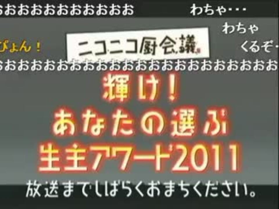 ニコニコ厨会議「輝け!あなたの選ぶ生主アワード2011」の巻<br />ついにその幕を閉じようとしている2011年!<br />今年も多くの生主たちが流星のごとく眩しく輝き、時に消えていきました。<br />今回は、番組をご覧の視聴者の投票により、数千人のノミネートの中から「覆面男優賞」「主演女優賞」「優秀新人賞」「生主アワード大賞」の4部門を選び出します!<br />本日はあなたのメールが生主アワード2011大賞を決定します。<br />[出演]<br />◆司会 二宮係長<br />◆前説・後説 ちくわちゃん<br />◆今回のゲスト<br />伊予柑,横山緑,真咲愛<br />◆天の声 ひげおやじ<br />2011/12/13(火) 開演:21:00 終了:22:03<br />来場者数:19564人 コメント数:30429<br />番組ID:<a href="https://live.nicovideo.jp/watch/lv73917615" target="_blank" rel="noopener">lv73917615</a><br />2/2→<a href="https://www.nicovideo.jp/watch/sm16419931" class="watch">sm16419931</a><br />厨会議後書き→<a href="https://www.nicovideo.jp/watch/sm16420180" class="watch">sm16420180</a><br />