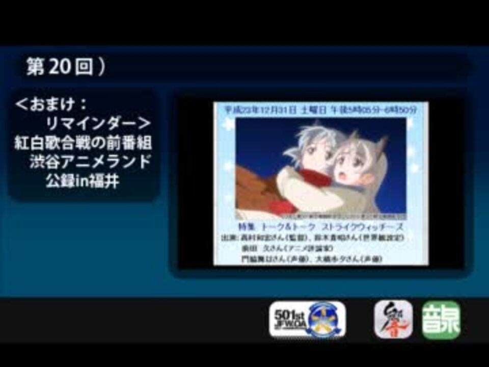 ■第19回:<a href="https://www.nicovideo.jp/watch/sm16427499" class="watch">sm16427499</a> ■第20回:ここ ■第21回:<a href="https://www.nicovideo.jp/watch/sm16695287" class="watch">sm16695287</a><br /><a href="https://www.nicovideo.jp/mylist/24675207" target="_blank" rel="noopener">mylist/24675207</a><br /><br /><<おわび>><br />「2011年まとめ」を期待していた、ごく一部の方々には申し訳ありませんが<br />今年中には間に合いませんでした。すいません。<br />「up主の気力」とか「HDD空き容量」を十分に補充した後、<br />「この番組」が放送終了する頃にまとめる予定です。<br />(「この番組」が終わってもストライク関連のラジオは何らかの形で続くはず…<br /> 「3期まで待機するためのラジオ番組」とか)