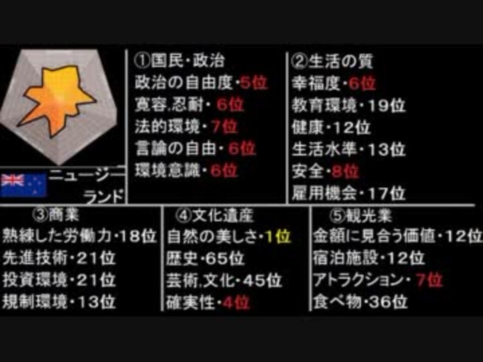 2011年11月Future Brand 社より、世界113ヶ国を対象に行われた調査による「Country Brand Index 2011」という資料が発表された。<br />この動画では総合TOP10とそれぞれの国の5分野23項目の順位を発表します。<br /><br /><font color="red"><font size="4">2012年ver作りました!⇒<a href="https://www.nicovideo.jp/watch/sm20020606" class="watch">sm20020606</a></font></font> ランキング系マイリスト⇒<a href="https://www.nicovideo.jp/mylist/26672001" target="_blank" rel="noopener">mylist/26672001</a>
