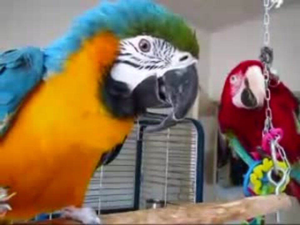 ルリ(青)とベニ(赤)の抗争動画。しばらく睨み合いした後、激しくぶつかり合う赤と青。最後にはカメラにまで攻撃してきます。殺伐とした2羽の後は、ちょこっとだけアーミーりょう登場。自ら車に乗り込んで、勝手にキュンキュンしてます。