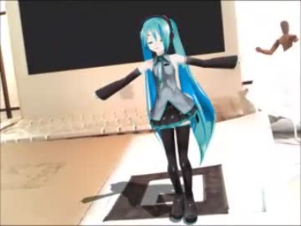 お借りしたもの<br />【モ デ ル】<a href="https://www.nicovideo.jp/watch/sm11205201" class="watch">sm11205201</a><br />【モーション】<a href="https://www.nicovideo.jp/watch/sm16541422" class="watch">sm16541422</a><br />【音 源】<a href="https://www.nicovideo.jp/watch/sm15457393" class="watch">sm15457393</a><br /><br />解説<br />【ミクの作成及び動作】"お借りしたもの"リンクより全てを合成。<br />【背景との合成】"ARToolKit"を使用することにより、四角いマークを閾値認識します。<br />これによりマークの上で、ミクが上記のリンクの条件を満たしつつ踊ります。(記:ルナ)<br /><br />【うp2日目】たくさんのコメントを頂き有難うございました。皆様のご意見・ご要望に応えるべく、今後の参考にしたいと思います。<br /><br /><br />【ベリーダンス】<a href="https://www.nicovideo.jp/watch/sm16798492" class="watch">sm16798492</a><br />【新作】ミクたんと一緒にご飯食べた!→<a href="https://www.nicovideo.jp/watch/sm16849594" class="watch">sm16849594</a><br />【等身大】→<a href="https://www.nicovideo.jp/watch/sm16856584" class="watch">sm16856584</a><br />最新作→<a href="https://www.nicovideo.jp/watch/sm17725140" class="watch">sm17725140</a><br /><br /><br />今まで作ったもの⇒<a href="https://www.nicovideo.jp/mylist/50729403" target="_blank" rel="noopener">mylist/50729403</a>