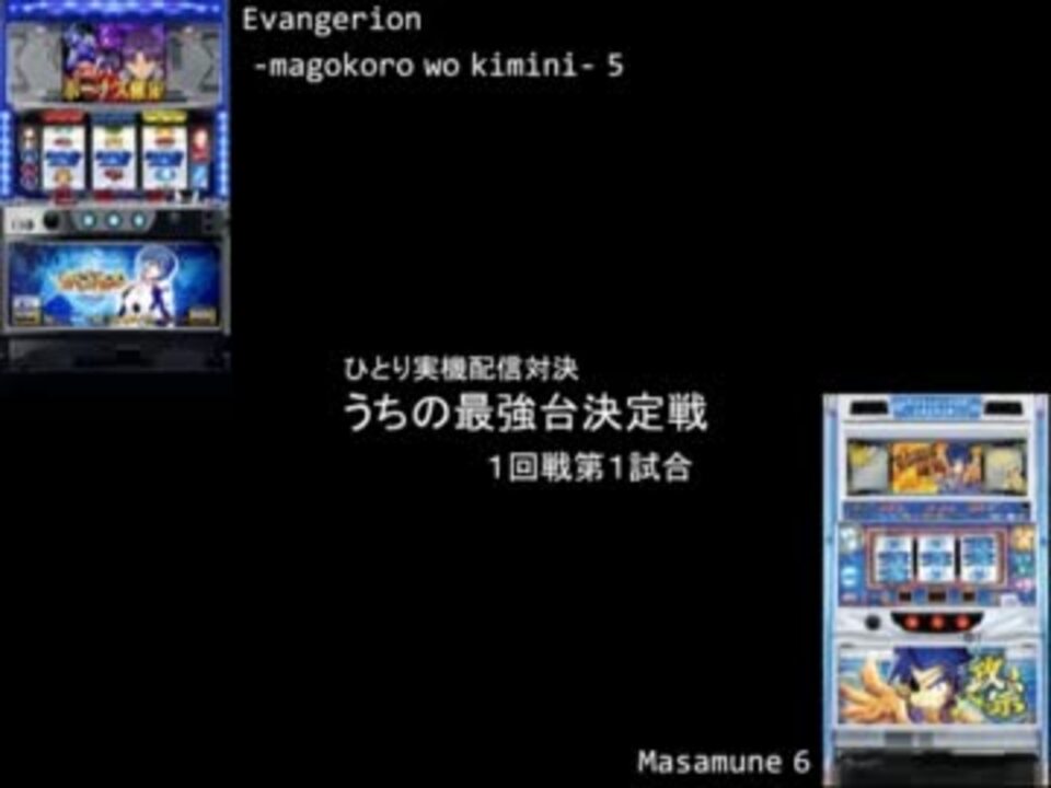 続き→<a href="https://www.nicovideo.jp/watch/sm16864428" class="watch">sm16864428</a><br /><br />うちにあるパチスロ実機8台のそれぞれ設定5・6を使用して最強台を決定するトーナメントを開催します。<br /><br /><ルール><br />・2000G差枚数勝負<br />・ART機はART中、前兆中の場合は最大200Gの延長可<br />・仮に全くの同数だった場合は機械割の低い方の勝ち<br />・1000Gでの中間発表あり<br /><br />参加機種<br />夢幻の如く(<a href="https://www.nicovideo.jp/mylist/18333759" target="_blank" rel="noopener">mylist/18333759</a>)<br />エヴァンゲリオンまごころを君に<br />銀河英雄伝説(<a href="https://www.nicovideo.jp/mylist/19064742" target="_blank" rel="noopener">mylist/19064742</a>)<br />ギラギラ爺夏(<a href="https://www.nicovideo.jp/mylist/21597738" target="_blank" rel="noopener">mylist/21597738</a>)<br />サクラ大戦3巴里は燃えているか(<a href="https://www.nicovideo.jp/mylist/25180984" target="_blank" rel="noopener">mylist/25180984</a>)<br />旋風の用心棒胡蝶の記憶(<a href="https://www.nicovideo.jp/mylist/28197717" target="_blank" rel="noopener">mylist/28197717</a>)<br />赤ドン雅(<a href="https://www.nicovideo.jp/mylist/29516386" target="_blank" rel="noopener">mylist/29516386</a>)<br />政宗<br /><br />うちの最強台決定戦マイリスト→<a href="https://www.nicovideo.jp/mylist/30202561" target="_blank" rel="noopener">mylist/30202561</a><br />ブログ→<a href="http://nankotsuhokusai.blog73.fc2.com/" target="_blank" rel="noopener nofollow">http://nankotsuhokusai.blog73.fc2.com/</a><br />ついったー→<a href="http://twitter.com/nanko2" target="_blank" rel="noopener nofollow">http://twitter.com/nanko2</a>