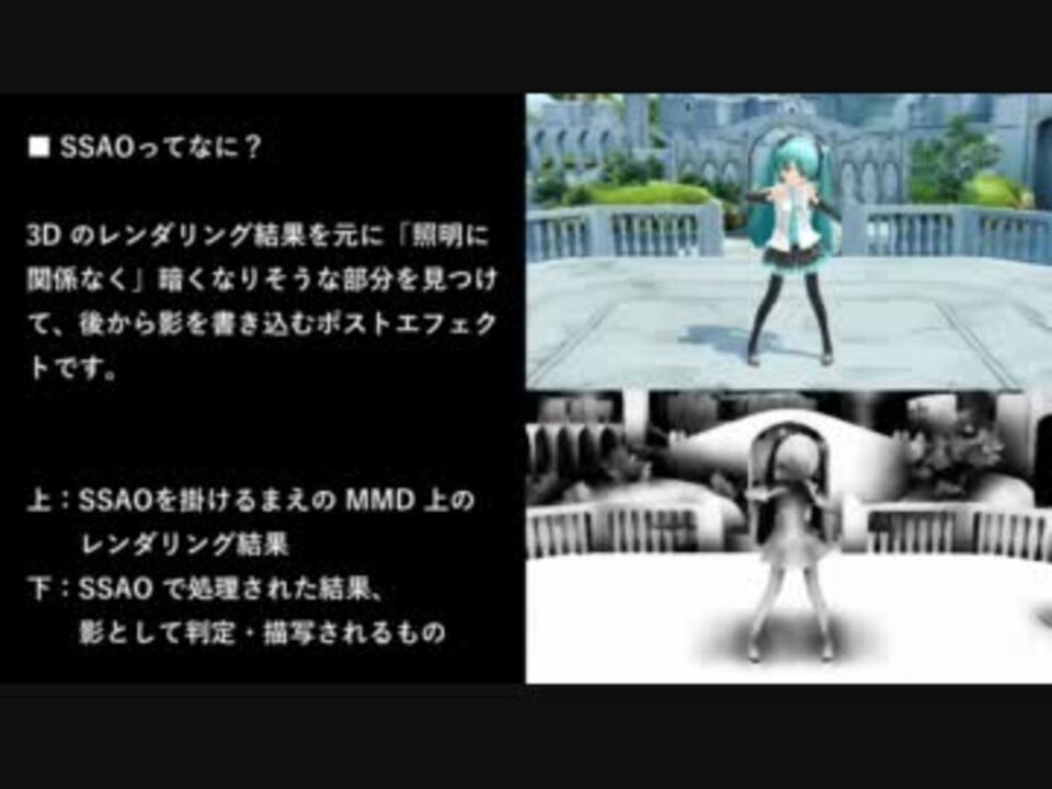 mqdl さんの定番エフェクトである「Screen Space Ambient Occlusion」エフェクト(<a href="https://www.nicovideo.jp/watch/sm13796840" class="watch">sm13796840</a>)を<br />1ヶ月ほど前から自分のエフェクトの透明対応に合わせて改造したものをニコ静画などで公開していたのですが<br />いろいろとバージョンが上げて機能追加したので静止画しかないですが、<br />配布動画を兼ねて簡単な解説動画を作ってみました。<br /><br />基本的には自分が行った改変部分のみに絞ったのですが、それでも文字ばっかりだ・・・<br />readme.txt もそうですが、分かりやすく&短く文章をまとめられる才能が欲しい orz<br /><br />■ 配布サイト → <a href="http://www.okoneya.ivory.ne.jp/mmd_files/" target="_blank" rel="noopener nofollow">http://www.okoneya.ivory.ne.jp/mmd_files/</a><br /> 拙作マイリスト(配布物):<a href="https://www.nicovideo.jp/mylist/28553703" target="_blank" rel="noopener">mylist/28553703</a><br /><br />・関連ニコ静画:<a href="https://seiga.nicovideo.jp/seiga/im1740079" target="_blank" rel="noopener">im1740079</a>、<a href="https://seiga.nicovideo.jp/seiga/im1742038" target="_blank" rel="noopener">im1742038</a>、<a href="https://seiga.nicovideo.jp/seiga/im1755615" target="_blank" rel="noopener">im1755615</a>、<a href="https://seiga.nicovideo.jp/seiga/im1763840" target="_blank" rel="noopener">im1763840</a>