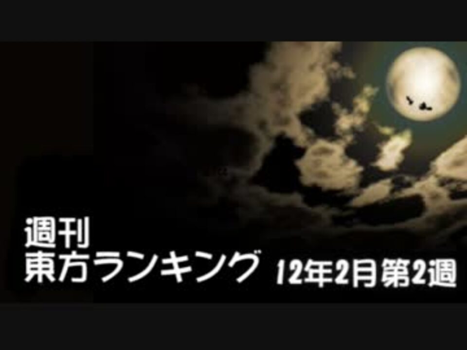 今週のプレイリスト[<a href="https://www.nicovideo.jp/mylist/30420009" target="_blank" rel="noopener">mylist/30420009</a>] ☆週刊東方ランキング一覧[<a href="https://www.nicovideo.jp/mylist/10450068" target="_blank" rel="noopener">mylist/10450068</a>]<br />[<a href="https://www.nicovideo.jp/watch/sm16902532" class="watch">sm16902532</a>]←2月第1週 次週→[<a href="https://www.nicovideo.jp/watch/sm17028770" class="watch">sm17028770</a>]<br /><br />【集計期間】 <font color="red">2/3(金) 6:00 - 2/10(金) 6:00</font><br />【集計方法】 ポイント数 = マイリスト数 + (再生数 ÷ 20)<br />【集計対象】 東方タグがついている作品、タイトルに東方が含まれる作品<br /><br />掲示板 → <a href="http://www2.atchs.jp/toho/" target="_blank" rel="noopener nofollow">http://www2.atchs.jp/toho/</a><br />データwiki → <a href="http://www39.atwiki.jp/tohoranking" target="_blank" rel="noopener nofollow">http://www39.atwiki.jp/tohoranking</a><br />エンドカード募集中!→ <a href="http://www5.atpages.jp/tohonico/joyful/" target="_blank" rel="noopener nofollow">http://www5.atpages.jp/tohonico/joyful/</a><br /><br />エコノミー回避のビットレート上昇にともない動画のビットレートを上げました。<br />集計期間や除外基準を変えました。<br />いろいろ怖い。<br /><br /><font color="red">第9回東方シリーズ人気投票</font><br /><a href="http://thwiki.info/th/vote9/" target="_blank" rel="noopener nofollow">http://thwiki.info/th/vote9/</a>