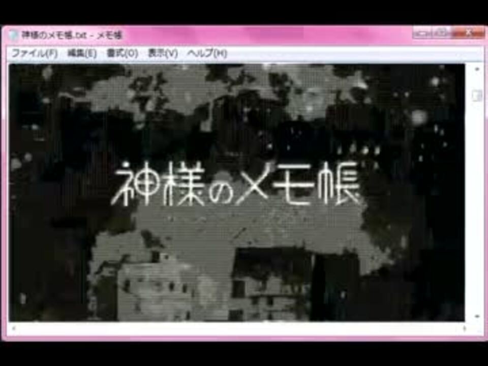 シリーズ10作目ということで、タグに度々付けられた「神様のメモ帳」のOPをやってみました。これで自分からタグに「神様のメモ帳」がつけられるよ!やったね!<br /><br />この動画でメモ帳シリーズを一旦終わろうかと思います。<br />説明動画出来ませんでした。代わりにニャル子さんでお許し下さい!<br /><br />私がやりたかった、「動画ファイルから直接txtに変換する」という業をやっている方がいました。負けましたorz:<a href="https://www.nicovideo.jp/watch/sm16974071" class="watch">sm16974071</a><br /><br />メモ帳シリーズマイリスト:<a href="https://www.nicovideo.jp/mylist/29620130" target="_blank" rel="noopener">mylist/29620130</a><br />次回→這いよれ!ニャル子さん:<a href="https://www.nicovideo.jp/watch/sm17786346" class="watch">sm17786346</a><br /><br />※音質の指摘がありましたが、どうもニコニコに上げた時に音質も再エンコードされてしまっているようでした。今の私では直すのは難しいです、すいません。