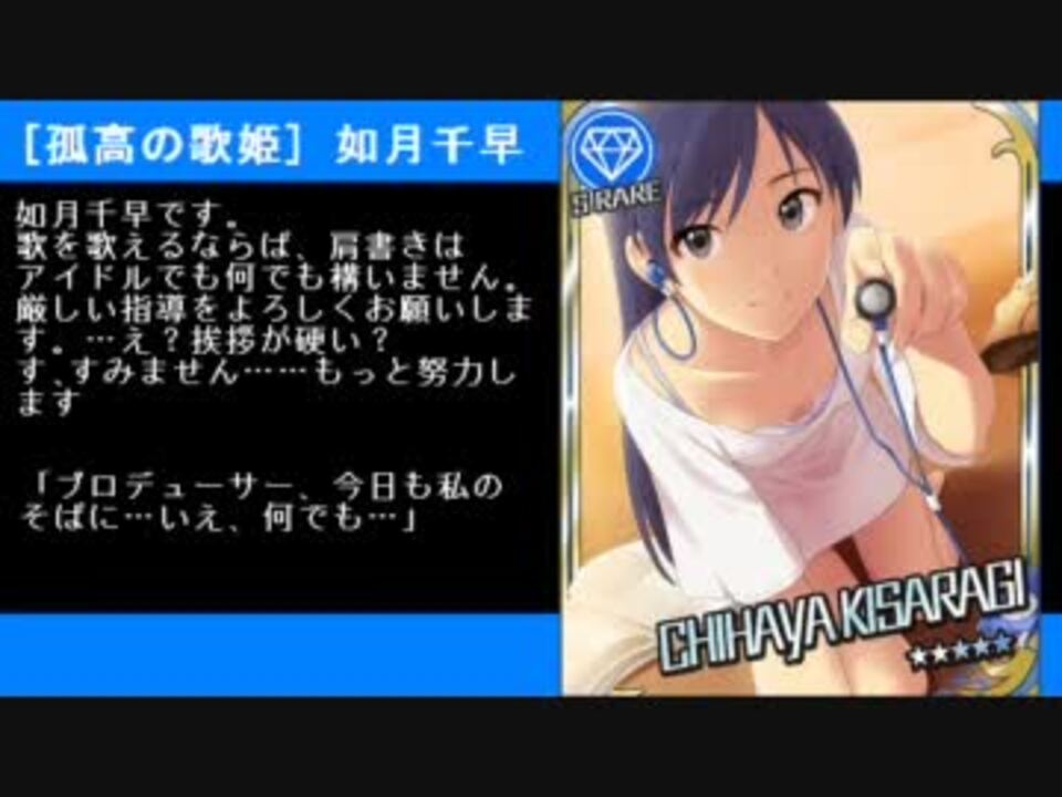 クール編<br />※二箇所ほど情報不足で???になってます。<br />※ミス訂正 [新春] 東郷あい 特技 ×クールダンス→○クールボイス(クール攻小アップ)<br /><br />BGM<br />1 キミはメロディ -JAZZ Rearrange Mix-(貴音)<br />2 隣に… -JAZZ Rearrange Mix-(あずささん)<br />3 シャララ(りっちゃん、あずささん)<br />4 恋するミカタ(りっちゃん)<br />5 晴れ色(あずささん)<br />6 Melted Snow(貴音)<br />7 約束(千早)<br />8 DREAM(貴音、りっちゃん)<br />9 LOST(あずささん、千早)<br /><br />キュート編→<a href="https://www.nicovideo.jp/watch/sm17017459" class="watch">sm17017459</a> パッション編→<a href="https://www.nicovideo.jp/watch/sm17054899" class="watch">sm17054899</a> 続編→<a href="https://www.nicovideo.jp/watch/sm17304529" class="watch">sm17304529</a> 前作→<a href="https://www.nicovideo.jp/watch/sm16721607" class="watch">sm16721607</a><br /><br />アイマス2全曲メドレー→<a href="https://www.nicovideo.jp/mylist/28057554" target="_blank" rel="noopener">mylist/28057554</a> 春香・千早・美希でメドレー→<a href="https://www.nicovideo.jp/mylist/28057617" target="_blank" rel="noopener">mylist/28057617</a> その他アイマス関連→<a href="https://www.nicovideo.jp/mylist/26245660" target="_blank" rel="noopener">mylist/26245660</a>