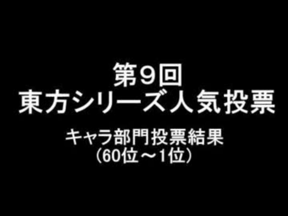 2012/2/19 0:00 ~ 2012/2/25 24:00 に開催された第9回東方シリーズ人気投票のキャラ部門集計結果(60位~1位)を動画にまとめたものです。追記:投コメ復旧。お騒がせしました。(1位~140位全キャラ+詳細結果の動画が来ていたので紹介→<a href="https://www.nicovideo.jp/watch/sm17085574" class="watch">sm17085574</a>。超ハイレベルな音楽部門の動画も来てたので紹介→<a href="https://www.nicovideo.jp/watch/sm17090283" class="watch">sm17090283</a>)