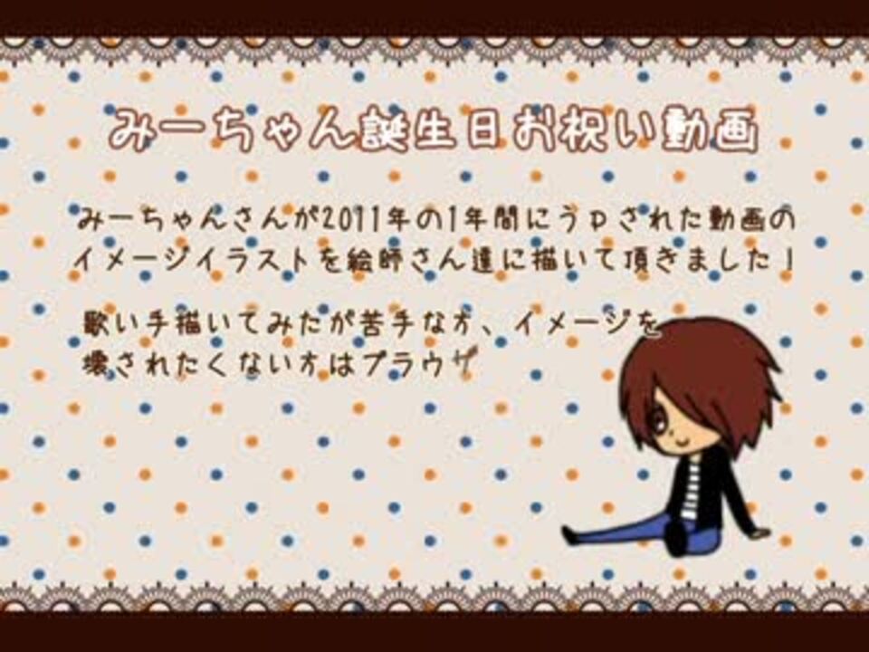 みーちゃんさんお誕生日おめでとうございます!<br /><br />去年に引き続き絵師さん達にお願いして歌い手描いてみた動画を作りました。みーちゃんさんが2011年に歌われた曲のイメージイラストとなっています。長いので作業用BGMにどうぞ!<br />去年の動画・・・ <a href="https://www.nicovideo.jp/watch/sm13817246" class="watch">sm13817246</a> <br /><br />歌い手描いてみたが苦手な方はご注意ください。<br /><br /><br />【みーちゃんさんマイリスト】<a href="https://www.nicovideo.jp/mylist/11081986" target="_blank" rel="noopener">mylist/11081986</a> <br /><br />【企画主】きのと・あだみぃ<br /> 【動画編集】おむ (<a href="https://www.nicovideo.jp/mylist/26819988" target="_blank" rel="noopener">mylist/26819988</a>)<br />【イラスト】 ぴヲすけ・赤玉子・もんち・あだみぃ・雫・葉壱・土屋・しも。・きのと・京・八四一 (敬称略)<br />