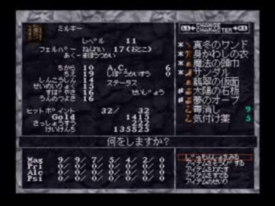 お前幸せ者だよな。乾物の癖に。<br />*バグ未修正版でプレイしています*<br />▼マイリスト<br /> Part09 <a href="https://www.nicovideo.jp/watch/sm17482013" class="watch">sm17482013</a><br /> Part07 <a href="https://www.nicovideo.jp/watch/sm17342637" class="watch">sm17342637</a><br /> マイリスト <a href="https://www.nicovideo.jp/mylist/30228130" target="_blank" rel="noopener">mylist/30228130</a><br /> その他 <a href="https://www.nicovideo.jp/mylist/9226118" target="_blank" rel="noopener">mylist/9226118</a><br />▼縛りルール<br /> 1.宝箱は全部開ける 2.キャラ作成は一発勝負 3.ノーリセット 4.全滅するまで救出パーティは作らない使わない<br /> ※ほかは思いついたら<br />▼検索キー<br /> Wizardry、DIMGUIL、ダガシヤ<br />▼今回の動画で使用した素材(只管多謝)<br /> メッセージウィンドウ <a href="https://commons.nicovideo.jp/works/nc42663" target="_blank" rel="noopener">nc42663</a>(モリカドル様)<br /> イラスト <a href="https://www.nicovideo.jp/mylist/4839086" target="_blank" rel="noopener">mylist/4839086</a>(新城P様)