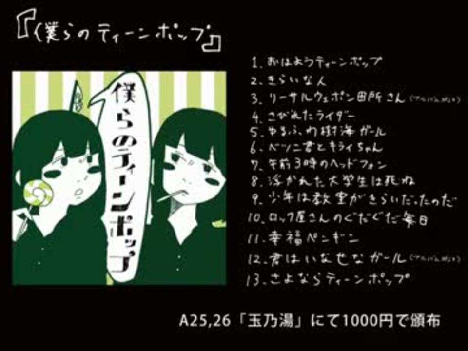 お久しぶりです石風呂です。<br />石風呂の1st.フルアルバム『僕らのティーンポップ』のクロスフェードです。<br /><br />2012.4.28-29 ReleaseTHE VOC@LOiD M@STER 20<br />A-25,26[玉乃湯]にて両日頒布<br />イベント価格:1,000<br /><br />通販情報 →<a href="http://www.toranoana.jp/mailorder/article/04/0030/04/23/040030042314.html" target="_blank" rel="noopener nofollow">http://www.toranoana.jp/mailorder/article/04/0030/04/23/040030042314.html</a><br />11曲目で、さいるさんに調声で参加してもらってます。感謝です。<br />miki…M-01,02,03,04,06,07,08,10,12<br />IA…M-05,09,12,13<br />ルカ…M-11<br /><br />石風呂→<a href="https://www.nicovideo.jp/mylist/25210180" target="_blank" rel="noopener">mylist/25210180</a> twitter@ishi_furo コミュ→co1091017<br /><br />全てのティーンエイジャーとティーンエイジャーだった人たちへ捧ぐアルバムです。