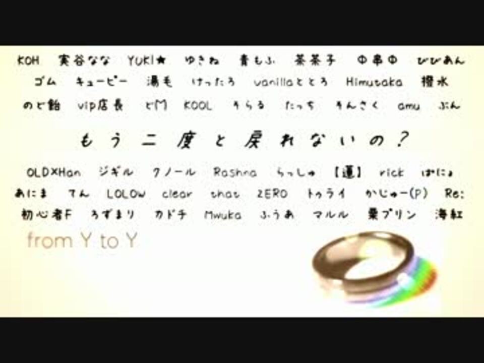 今回はジミーサムP様の「from Y to Y」の合唱を作らせて頂きました!<br />ぜひ、ヘッドホンでお聞き下さい!!<br /><br />◆本家様【<a href="https://www.nicovideo.jp/watch/sm6529016" class="watch">sm6529016</a>】<br />◆歌い手様(敬称略)<br />KOH/実谷なな/YUKI★/ゆきね/青もふ/茶茶子/Φ串Φ/びびあん/初心者F/ろずまり/カドチ/Mwuka/ふうあ/マルル/栗プリン/海紅/ゴム/キューピー/湯毛/けったろ/Vanillaととろ/Himutaka/Re:/のど飴/あにま/vip店長/撥水/どM/ぱにょ/てん/LOLOW/clear/that/ZERO/トゥライ/KOOL/そらる/そんさく/amu/OLD×Han/ジギル/Rashna/クノール/らっしゅ/ぶん/rick/【蓮】/かじゅー(P)/たっち<br /><br />◆使用させて頂いた動画の詳細 → <a href="https://www.nicovideo.jp/mylist/31827938" target="_blank" rel="noopener">mylist/31827938</a><br />◆合唱まとめ <a href="https://www.nicovideo.jp/mylist/28062341" target="_blank" rel="noopener">mylist/28062341</a><br />前作「インビジブル」→【<a href="https://www.nicovideo.jp/watch/sm17547706" class="watch">sm17547706</a>】<br />次作「六兆年と一夜物語」→【<a href="https://www.nicovideo.jp/watch/sm17818194" class="watch">sm17818194</a>】<br /><br />ツイッター → <a href="http://twitter.com/cherry_nico25" target="_blank" rel="noopener nofollow">http://twitter.com/cherry_nico25</a>