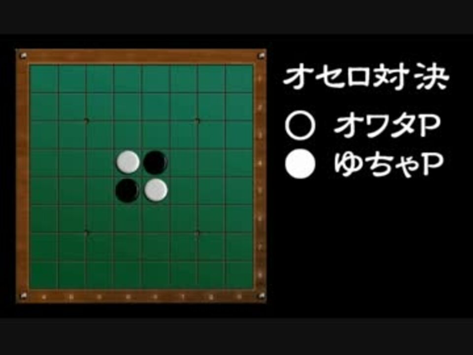 オワタPです。唐突ですがオセロ対戦実況を始めることになりました。<br />記念すべき初対戦相手はボーカロイドPのゆちゃPです。<br /><br />■ ルール:持ち時間5分、1手30秒、2本先取。<br />■ 訂正:1試合目●オワタP、2試合目○オワタP、3試合目●オワタPです。<br /><br />□ オワタP - <a href="https://www.nicovideo.jp/mylist/3236873" target="_blank" rel="noopener">mylist/3236873</a> ゆちゃP - <a href="https://www.nicovideo.jp/mylist/11120757" target="_blank" rel="noopener">mylist/11120757</a> まとめ - <a href="https://www.nicovideo.jp/mylist/31965666" target="_blank" rel="noopener">mylist/31965666</a> <font color="orange">◆</font> <a href="http://garunan.com" target="_blank" rel="noopener nofollow">http://garunan.com</a> <font color="orange">◆</font><br /><br />□ ゆちゃP 1st商業CD「Casino!」:<a href="http://exittunes.com/cd/exit_tunes/qwce00228.html" target="_blank" rel="noopener nofollow">http://exittunes.com/cd/exit_tunes/qwce00228.html</a><br />□ 対戦相手は随時募集中です。<br /><br />■ PREV - *** / NEXT - <a href="https://www.nicovideo.jp/watch/sm17846811" class="watch">sm17846811</a> vs cosMo@暴走P