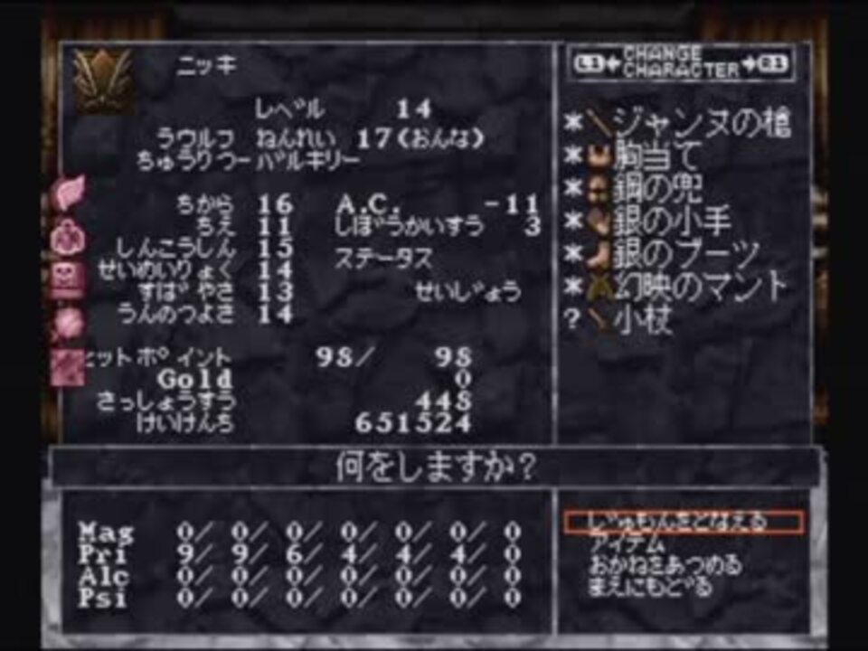 キツネの中、あったかいナリィ…<br />*バグ未修正版でプレイしています*<br />▼マイリスト<br /> Part15 <a href="https://www.nicovideo.jp/watch/sm17923506" class="watch">sm17923506</a><br /> Part13 <a href="https://www.nicovideo.jp/watch/sm17800339" class="watch">sm17800339</a><br /> マイリスト <a href="https://www.nicovideo.jp/mylist/30228130" target="_blank" rel="noopener">mylist/30228130</a><br /> その他 <a href="https://www.nicovideo.jp/mylist/9226118" target="_blank" rel="noopener">mylist/9226118</a><br />▼縛りルール<br /> 1.宝箱は全部開ける 2.キャラ作成は一発勝負 3.ノーリセット 4.全滅するまで救出パーティは作らない使わない<br /> ※ほかは思いついたら<br />▼検索キー<br /> Wizardry、DIMGUIL、ダガシヤ<br />▼今回の動画で使用した素材(只管多謝)<br /> メッセージウィンドウ <a href="https://commons.nicovideo.jp/works/nc42663" target="_blank" rel="noopener">nc42663</a>(モリカドル様)