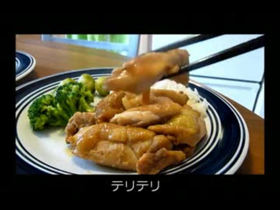 第15弾。今回は、アメリカの日本食、CHICKEN TERIYAKIです。TERIYAKIは、寿司、天ぷらと並ぶくらいメジャーです。ただアメリカのTERIYAKIの定義は、ソースに漬け込んで焼くで、タレを塗りながら焼く日本の手法と異なります。提案したのはKIKKOMANです。また、アメリカは胸肉よりモモ肉の方が安いです。日本と逆ですね。脂の少ないヘルシーな胸肉、通称ホワイトミートの方が好まれているためです。今回はダークミートであるモモ肉をがっつりいただきました。 アメリカの食卓集→<a href="https://www.nicovideo.jp/mylist/31912293" target="_blank" rel="noopener">mylist/31912293</a>