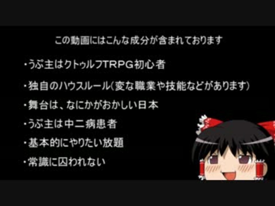 ほとんどの人ははじめまして。某クイズゲームのゆっくり実況をしているにきゅと申します。<br />この度クトゥルフを見てたらどうしてもやりたくなったので、つい作りました。<br />矛盾点がたくさんあるかも知れませんが、やりたい放題な連中がひっちゃかめっちゃかにやらかす戦闘メインのクトゥルフとなります。<br />第一話で一部設定を見直すかもしれませんが、生暖かい目で見守っていただけると幸いです。<br />字幕の文字のサイズが結構ばらばらなので、次回からサイズをある程度決めようと思います。<br /><br />それでは、ゆっくりしていってね!!!<br /><br />前回>>>なし 1話 <a href="https://www.nicovideo.jp/watch/sm18071183" class="watch">sm18071183</a><br />マイリスト<a href="https://www.nicovideo.jp/mylist/32334729" target="_blank" rel="noopener">mylist/32334729</a><br />追記:立ち絵がくっつくのは3話からとなります。それまで饅頭をご覧くださいませ。