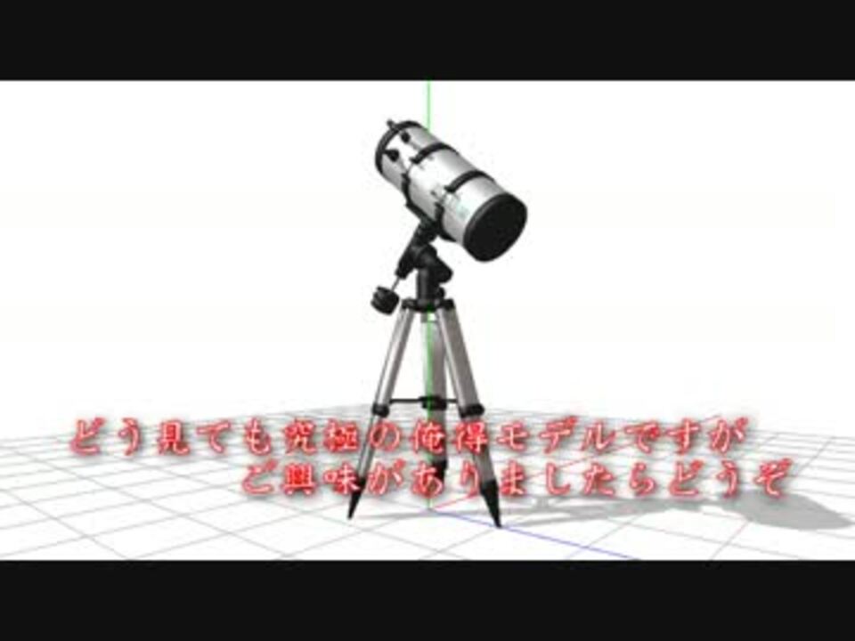 <strong>どう見ても究極の俺得モデルです、本当に(ry</strong><br><br> というわけで謎の発作が起きて、天体望遠鏡モデルを作ってしまいました。ニュートン式反射望遠鏡という設定です。<br> 各部可動しますんで、多少いろいろ使えるはずです。材質とか変えれば少し古風になるかも。<br> なお、作者の天体望遠鏡知識は古いので細かい点はご容赦を。<br><br>■他の投稿動画→<a href="https://www.nicovideo.jp/mylist/29859184" target="_blank" rel="noopener">mylist/29859184</a><br>■配布場所→<a href="http://ryntaro-n.anime.coocan.jp/MMD.htm" target="_blank" rel="noopener nofollow">http://ryntaro-n.anime.coocan.jp/MMD.htm</a><br><br>□追記<br>前半の「部屋」はvueで作ったbmpを背景にしたものなので配布しようがありません、ご勘弁を。