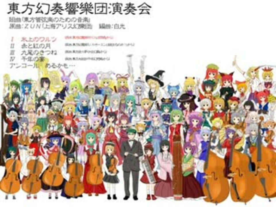 グダグダと少しづつやって、一年半かけてようやく完成です。今回のアレンジはよりオーケストラらしく濃い編曲で、なるべく東方世界を壊さないように意識して仕上げました。原曲が迷子になっているかもしれませんが・・・。<br />【あっきー様】宣伝ありがとうございます!!<br />【2012/7/6追記】mp3配布します。zip形式(曲の解説、サムネ絵、mp3入り)パスは「東方オケ」です。<a href="http://www1.axfc.net/uploader/C/so/169523" target="_blank" rel="noopener nofollow">http://www1.axfc.net/uploader/C/so/169523</a><br />サムネ絵<a href="http://www.pixiv.net/member_illust.php?mode=medium&illust_id=28401988" target="_blank" rel="noopener nofollow">http://www.pixiv.net/member_illust.php?mode=medium&illust_id=28401988</a> 楽譜庫→<a href="https://www.nicovideo.jp/mylist/32698411" target="_blank" rel="noopener">mylist/32698411</a><br />氷上のワルツ (東方紅魔郷「おてんば恋娘」から) 0:37~<br />赤と紅の月 (東方紅魔郷「U.Nオーエンは彼女なのか?」から)3:26~ <br />九尾の狐 (東方妖々夢「少女幻葬」から)10:25~ <br />千年の宴 (東方永夜抄「千年幻想郷」から)16:08~