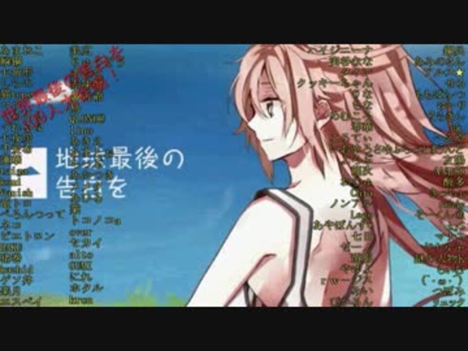 もし、あなたは世界最後の日、100人から告白されたとします。<br />あなたはどうしますか?<br />私だったら…<br /><br />フォオオオオオオオwwwww<br />って感じになります。<br />みなさんも同じじゃないですかね。<br />そんな事を考えながら作りました。<br />本家様<br /><a href="https://www.nicovideo.jp/watch/sm18198019" class="watch">sm18198019</a><br />使用動画様はマイリストにまとめています。<br />感謝の一言です。<br />マイリスト<br /><a href="https://www.nicovideo.jp/mylist/28859312" target="_blank" rel="noopener">mylist/28859312</a><br />どうぞこれも見ていってください。<br /><a href="https://www.nicovideo.jp/watch/sm18138362" class="watch">sm18138362</a><br />rayzly様 トコノコα様 レージス様 あまとぉ。様 千夜炭様の名前を間違えてしまいました。<br />halyosy様 jim様の名前が抜けておりました。<br />申し訳ございませんでした。<br />今後の合唱制作にて、このような事が起こらないよう全力で努めてまいります。<br />