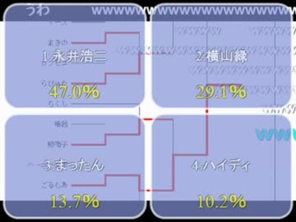 2012/07/14(土)開演:21:30 <a href="https://live.nicovideo.jp/watch/lv100293271" target="_blank" rel="noopener">lv100293271</a> 男性部門が終了した後、男女混合の優勝決定戦(<a href="#" class="seekTime" data-seekTime="5:30" onclick="seekNicoPlayer('#5:30'); return false;">#5:30</a>)が行われました。最強歴代配信者に輝いたのは・・・!?