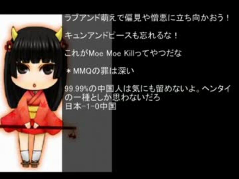 中国人じゃなくて英語圏の人々の反応です<br />Sankaku Complex(<a href="http://www.sankakucomplex.com/)のJapan" target="_blank" rel="noopener nofollow">http://www.sankakucomplex.com/)のJapan</a> Fights China with Moe, China Crushedって記事とコメを翻訳<br />BGMは親作品をご覧下さい。<br /><br />うp主のマイリス(<a href="https://www.nicovideo.jp/mylist/17380286" target="_blank" rel="noopener">mylist/17380286</a>)<br /><br />2010/11/01 台湾メディアが釣れたようです(<a href="https://www.nicovideo.jp/watch/sm12614841" class="watch">sm12614841</a>)<br />2010/11/25 中国人の反応まとめが追加されたみたい( <a href="http://blog.livedoor.jp/kashikou/archives/51608893.html" target="_blank" rel="noopener nofollow">http://blog.livedoor.jp/kashikou/archives/51608893.html</a> )<br />2012/07/22 BGMの関係で消されたので修正して再うp