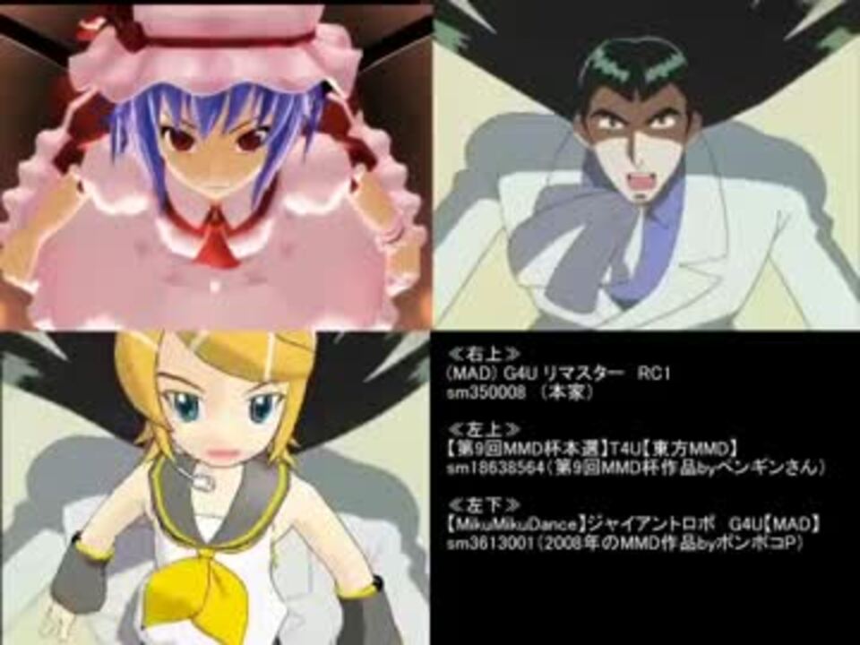 ■右上:(MAD) G4U リマスター RC1 (<a href="https://www.nicovideo.jp/watch/sm350008" class="watch">sm350008</a>)<br />■左上:【第9回MMD杯本選】T4U【東方MMD】 (<a href="https://www.nicovideo.jp/watch/sm18638564" class="watch">sm18638564</a>)<br />■左下:【MikuMikuDance】ジャイアントロボ G4U【MAD】 (<a href="https://www.nicovideo.jp/watch/sm3613001" class="watch">sm3613001</a>)<br /><br />最初はG4U×T4Uだけのつもりだったのですが、途中で<br />ポンポコPの作品の存在を思い出したので追加しました。<br />4年間のMMDの進歩が垣間見えるかと思います。<br /><br />≪追記≫<br />希望があれば作ろうと思っていたけど、その必要はなかった。<br />T4U×G4Uのみ⇒【比較】T4U × G4U【東方MMD×GRMAD】(<a href="https://www.nicovideo.jp/watch/sm18648922" class="watch">sm18648922</a>)<br />T4U×ミク版G4Uのみ⇒ミク版G4UとT4Uを比較してみた(<a href="https://www.nicovideo.jp/watch/sm18653115" class="watch">sm18653115</a>)<br />【比較:重ねてみた】T4U × G4U【東方MMD×GRMAD】(<a href="https://www.nicovideo.jp/watch/sm18655130" class="watch">sm18655130</a>)<br />ぺんぎんさん、ネオニアさん、因幡トモさん、動画説明での紹介ありがとうございます。<br />過去に作った比較動画<a href="https://www.nicovideo.jp/mylist/48410878" target="_blank" rel="noopener">mylist/48410878</a>