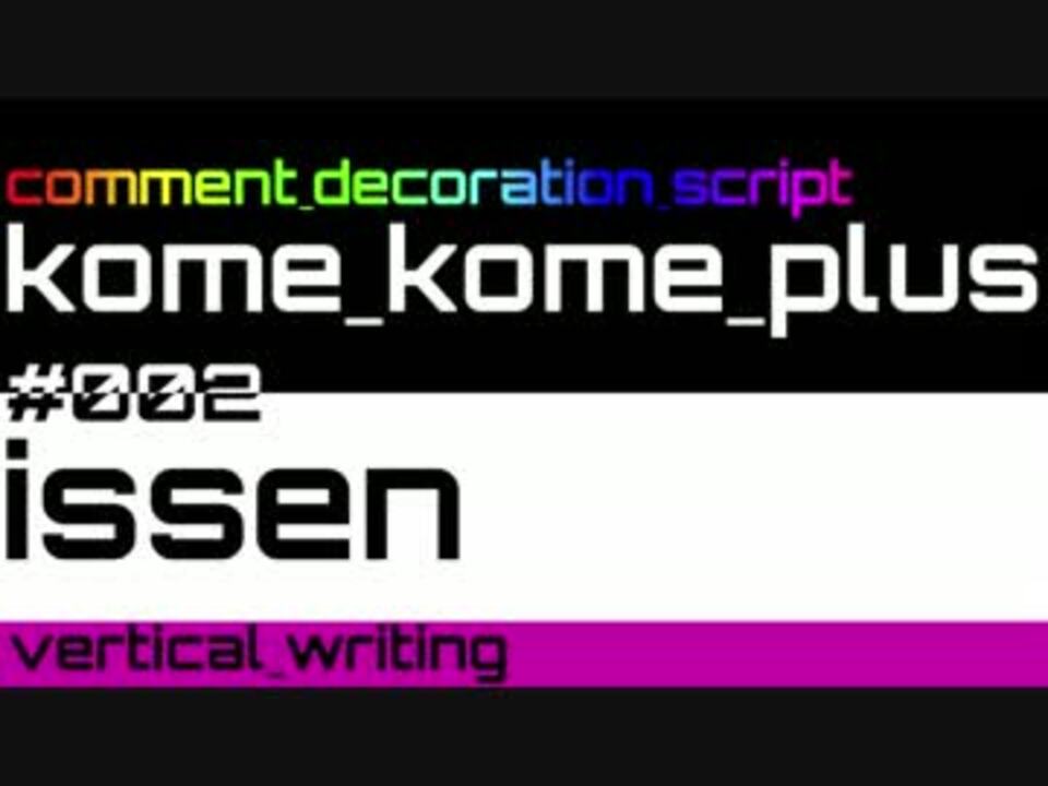 <font size="2" color="#ff0000">※バージョン4の開発は終了いたしました。</font><br /><br /><font size="1">▼</font> 最新情報は以下のページに記載しております。<br /><font size="3"><u><a href="http://techmix.jp/nicosmaker/" target="_blank" rel="noopener nofollow">http://techmix.jp/nicosmaker/</a></u></font><br /><br /><font color="#c0c0c0"><font size="3">米米PLUS</font> <font size="1">version4.0 </font> <i>#002</i> <br /><font size="5"><b>issen</b></font> / vertical writing <br />縦書きで表示したコメントを一閃で斬り捨てます<br /><br /> 導入方法はこちら↓↓↓<br /> <u><a href="http://techmix.jp/k2p" target="_blank" rel="noopener nofollow">http://techmix.jp/k2p</a></u><br /><br /> 横書きはこちら↓↓↓<br /> <a href="https://www.nicovideo.jp/watch/sm18671691" class="watch">sm18671691</a><br /><br /> 装飾一覧はこちら↓↓↓<br /> <a href="https://www.nicovideo.jp/mylist/33436104" target="_blank" rel="noopener">mylist/33436104</a><br /><br />────────────────────────────────<br /> <font color=""><b>BGM</b></font> Daft Punk - One More Time (ニコニコ許諾楽曲)</font>