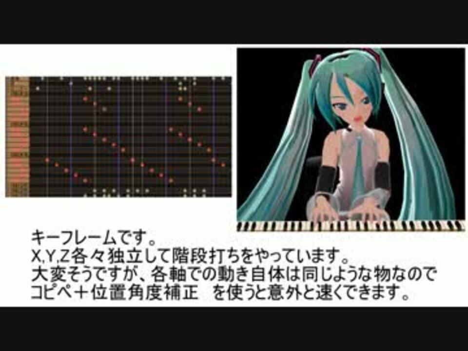 9杯本選動画(<a href="https://www.nicovideo.jp/watch/sm18661485" class="watch">sm18661485</a>)ではモーションについてたくさんのお褒めの言葉を頂きありがとうございました。<br />ということで、調子に乗って講座とかうpします。指と表情以外のモーションを解説してみました。何かのご参考になれば幸いです。字多いので一時停止推奨ですw<br /><br />ぅわああああぁ・・早速秘密結社の重鎮と番人様が・・・<br />顎モーフ→<a href="https://seiga.nicovideo.jp/seiga/im2356085" target="_blank" rel="noopener">im2356085</a> 手のボーンをちょっと改造→<a href="https://seiga.nicovideo.jp/seiga/im2355601" target="_blank" rel="noopener">im2355601</a><br />作ったもの→<a href="https://www.nicovideo.jp/mylist/14135465" target="_blank" rel="noopener">mylist/14135465</a>