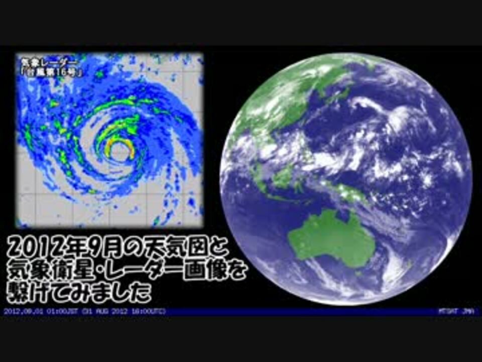 2つの台風襲来とすっかり秋めいた日本列島、<br />そんな2012年9月の天気図と気象衛星・レーダー画像を繋げてみました。<br /><br />■映像は 気象庁 で公開されている画像を動画化しています<br /> <a href="http://www.jma.go.jp/" target="_blank" rel="noopener nofollow">http://www.jma.go.jp/</a><br />■BGMは LUNAR ETERNAL BLUE より「正義の使者"仮面の白騎士"参上!!」<br /><br />■2012年8月衛星画像(<a href="https://www.nicovideo.jp/watch/sm18770637" class="watch">sm18770637</a>)←前 次→2012年10月(<a href="https://www.nicovideo.jp/watch/sm19253135" class="watch">sm19253135</a>)<br /> マイリスト:月刊 <a href="https://www.nicovideo.jp/mylist/21644544" target="_blank" rel="noopener">mylist/21644544</a> 年刊 <a href="https://www.nicovideo.jp/mylist/21644629" target="_blank" rel="noopener">mylist/21644629</a><br /><font color="#ffffff"> マイリスト:</font>増刊 <a href="https://www.nicovideo.jp/mylist/28093639" target="_blank" rel="noopener">mylist/28093639</a><br /><font size="1">※掲載データは速報値を使用している為、後日変更される可能性がございます。<br /> また富士山と南極昭和基地での観測値は、除外しています。</font>