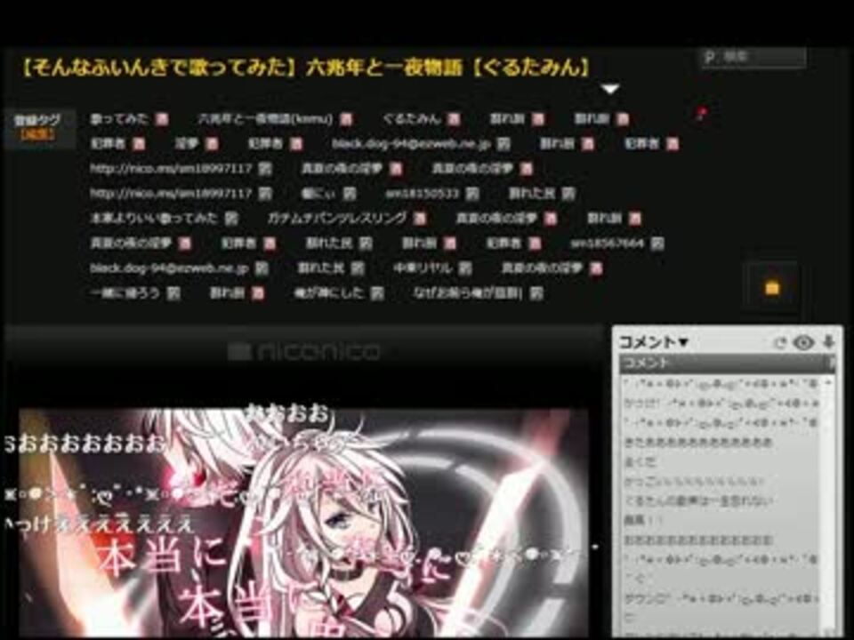こちらの動画<a href="https://www.nicovideo.jp/watch/sm19109957" class="watch">sm19109957</a>の2012年10月13日21時半頃の様子が面白かったので録画しました。<br />全画面表示推奨。<br /><a href="https://www.nicovideo.jp/user/1422150/video" target="_blank" rel="noopener">myvideo/1422150</a>