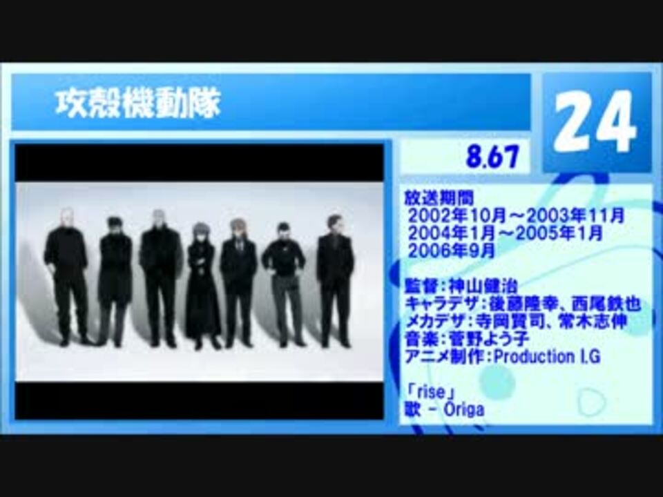この動画は「ANIME NEWS NET WORK」というサイトで<br />評価の高い日本のアニメをランキング形式で紹介させて頂くものです。<br />最後のBGMはef - a tale of melodiesの「Lights」です。<br />詳細や計算方式については前回の動画に説明があります。<br /><br />ANIME NEWS NETWORK ↓<br /><a href="http://www.animenewsnetwork.com/encyclopedia/ratings-anime.php?top50=best_bayesian" target="_blank" rel="noopener nofollow">http://www.animenewsnetwork.com/encyclopedia/ratings-anime.php?top50=best_bayesian</a><br /><br />51位~100位→<a href="https://www.nicovideo.jp/watch/sm19273147" class="watch">sm19273147</a>