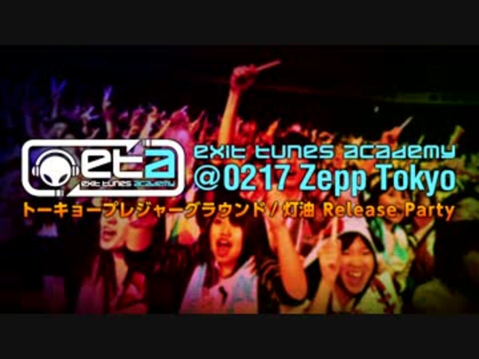 <b>開場前グッズ販売はAM10時よりスタート!!<br />※チケットをお持ちでない方もご利用いただけます。<br /></b><br />[タイトル]EXIT TUNES ACADEMY@0217 Zepp Tokyo<br />~ トーキョープレジャーグラウンド / 灯油 Release Party ~<br />[日程]2013年2月17日(日)<br />[会場]Zepp Tokyo(東京)<br />[開場/開演]開場15:00/開演16:00<br />[チケット料金]<br />eta.jp会員特別価格 2,480円(税抜)<br />コミュニティ先行価格 1,980円(税抜)<br /><a href="http://eta.jp/ticket0217" target="_blank" rel="noopener nofollow">http://eta.jp/ticket0217</a> ※1/14(祝・月)23時まで<br /><br />[出演者]亜沙/Starving Trancer(Another Infinity)feat.Mayumi Morinaga/__(アンダーバー)/164/ぐるたみん/cosMo@暴走P/しゃむおん/スズム(あすかそろまにゃーず/KEMUVOXX)/赤飯/そらる/DJUTO/デッドボールP/灯油/Nem/Neru/add9(ヘリP)/松下/まふまふ/みきとP/recog/YM<br /><br /><b>EXIT TUNES ACADEMYを100倍楽しむ為の諸注意!!<br /><a href="https://www.nicovideo.jp/watch/sm19375774" class="watch">sm19375774</a><br /></b>