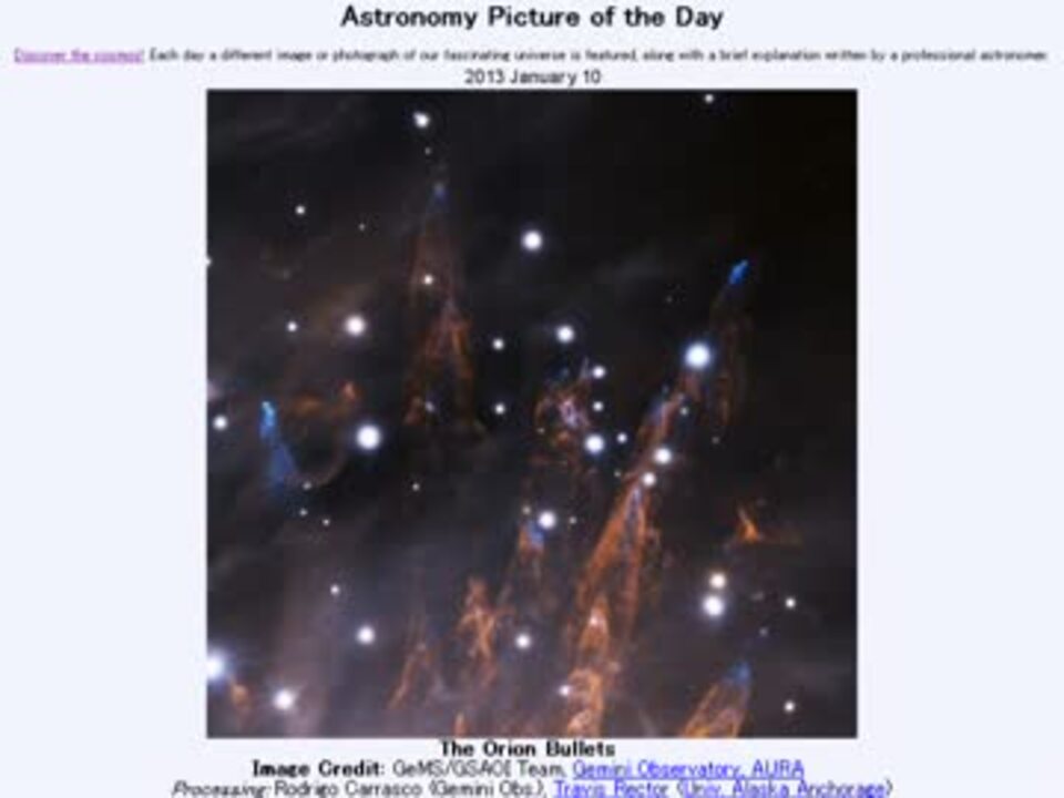 1月10日 Astronomy Picture of the Day - The Orion Bullets 「オリオンの弾丸」です。APODとはNASAが直近の天文現象に関する写真を、天文学者の説明を添えて毎日1枚公開しているサイトです。英語の勉強に読んでます。間違いがあれば指摘いただけると嬉しいです。美しい写真と原文:<a href="http://apod.nasa.gov/apod/ap130110.html" target="_blank" rel="noopener nofollow">http://apod.nasa.gov/apod/ap130110.html</a> お借りした音源様:<a href="https://commons.nicovideo.jp/works/nc64242" target="_blank" rel="noopener">nc64242</a> APODreadingマイリスト <a href="https://www.nicovideo.jp/mylist/36151593" target="_blank" rel="noopener">mylist/36151593</a> (2013年1月分) (<a href="https://www.nicovideo.jp/watch/sm19797200" class="watch">sm19797200</a><前日 翌日><a href="https://www.nicovideo.jp/watch/sm19813309" class="watch">sm19813309</a>)