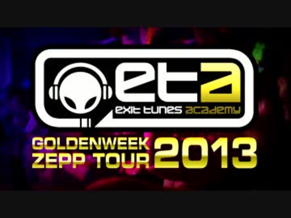 <font size="4" color="#ffd700"><b>EXIT TUNES ACADEMY GOLDENWEEK ZEPP TOUR 2013</font><br />[会場]<br />0429(Mon)@Zepp Sapporo<br />0504(Sat)@Zepp Fukuoka<br />0510(Fri)@Zepp Nagoya<br />0511(Sat)@Zepp Namba<br />0519(Sun)@Zepp Tokyo</b><br /><br />[開場/開演]会場により異なります。<br />[チケット料金]<br />eta.jp会員特別価格 2,480円(税込2,604円)<br />コミュニティ先行価格 1,980円(税込2,079円)<br />※2/11(祝・月)23時まで<br /><br />[出演者]亜沙/__(アンダーバー)/164/ぐるたみん/cosMo@暴走P(名古屋公演のみ出演)/しゃむおん/スズム/Starving Trancer(Another Infinity) feat.Mayumi Morinaga/赤飯/そらる/DJ UTO/デッドボールP/灯油/ふわりP(大阪公演を除き出演)/松下/みきとP/りょーくん/YM<br />※出演者は変更になる場合があります。予めご了承ください。<br /><br /><b>EXIT TUNES ACADEMYを100倍楽しむ為の諸注意!!<br /><a href="https://www.nicovideo.jp/watch/sm19375774" class="watch">sm19375774</a><br /></b>