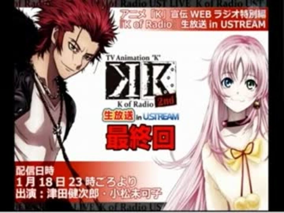 1/18にUstで生配信されたアーカイブ動画<br /><br />2012年10月から放送開始のアニメ「K」のWEBラジオ<br />パーソナリティ:津田健次郎(周防 尊役)<br /> 小松未可子(ネコ役)<br />公式:<a href="http://www.animate.tv/radio/details.php?id=KR" target="_blank" rel="noopener nofollow">http://www.animate.tv/radio/details.php?id=KR</a><br />次→<a href="https://www.nicovideo.jp/watch/sm19927923" class="watch">sm19927923</a><br />ラジオドラマまとめ(1回~7回)→<a href="https://www.nicovideo.jp/watch/sm18997949" class="watch">sm18997949</a><br />ラジオ第1期まとめ→<a href="https://www.nicovideo.jp/mylist/32819593" target="_blank" rel="noopener">mylist/32819593</a><br />ラジオ第2期まとめ→<a href="https://www.nicovideo.jp/mylist/34057690" target="_blank" rel="noopener">mylist/34057690</a><br />上げた動画→<a href="https://www.nicovideo.jp/mylist/24839810" target="_blank" rel="noopener">mylist/24839810</a><br />※毎週金曜日更新