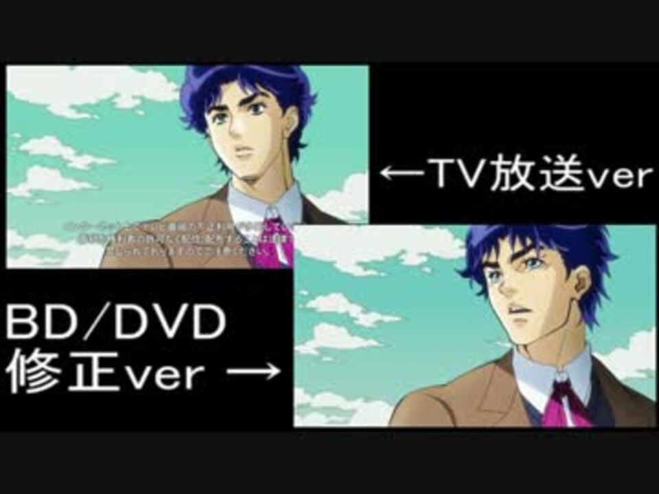 <br /><font size="5" color="blue">ジョナサン「ひっ!比較するだァーッ!」</font><br /><br />※「ジョジョの奇妙な冒険」BD&DVD発売記念!! 前回(<a href="https://www.nicovideo.jp/watch/sm19954117" class="watch">sm19954117</a>)のコメントを参考に作り直した比較動画です。音声はBD/DVD版を使用しています。<br /><br /><font size="3" color="red">※この動画で紹介したシーン以外もかなり修正されてますので、興味がある方はBD/DVDの購入を検討されてはいかがでしょうか?</font><br /><br />■低負荷ver→<a href="https://www.nicovideo.jp/watch/sm19969160" class="watch">sm19969160</a><br /><br />-投稿動画-<br />■【比較動画+その他】→<a href="https://www.nicovideo.jp/mylist/28630292" target="_blank" rel="noopener">mylist/28630292</a><br />■【Fateシリーズ】→<a href="https://www.nicovideo.jp/mylist/26072263" target="_blank" rel="noopener">mylist/26072263</a><br />■【まどか☆マギカ(Commentary&Spesial)】→<a href="https://www.nicovideo.jp/mylist/25654557" target="_blank" rel="noopener">mylist/25654557</a><br />■【まどか☆マギカ(Sound Track)】→<a href="https://www.nicovideo.jp/mylist/27578527" target="_blank" rel="noopener">mylist/27578527</a><br />■【まどか☆マギカ(MADリンク)】→<a href="https://www.nicovideo.jp/mylist/27412891" target="_blank" rel="noopener">mylist/27412891</a>
