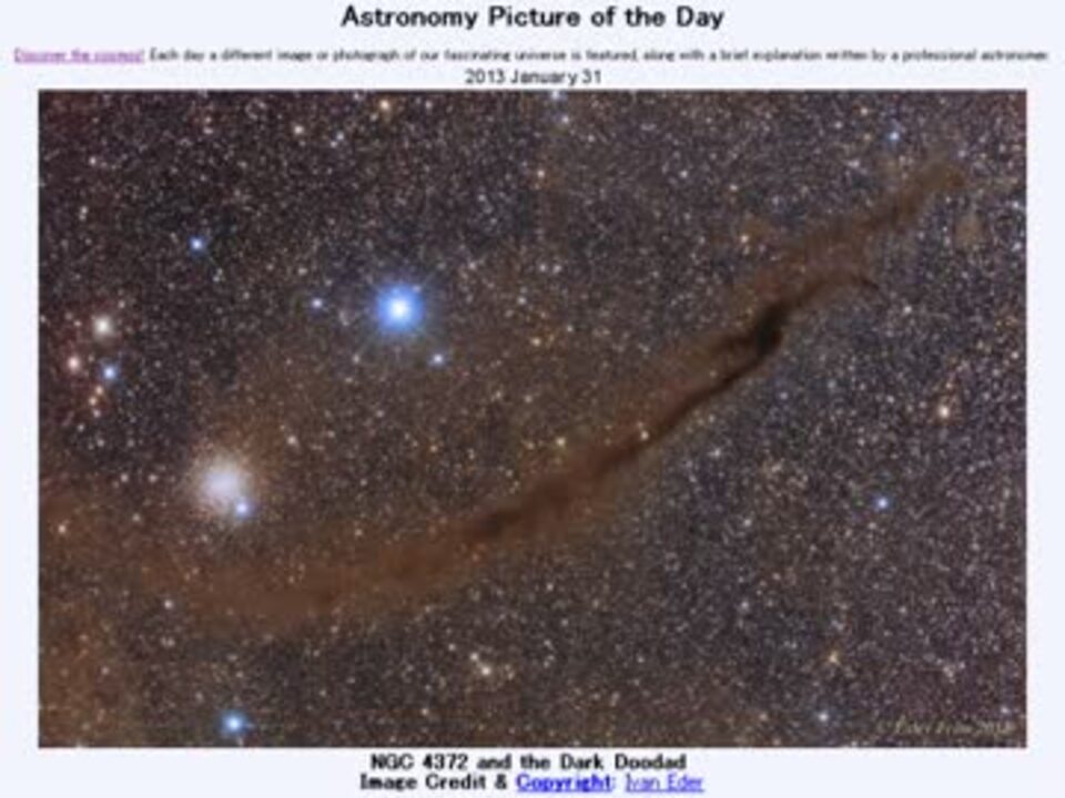 1月31日 Astronomy Picture of the Day - NGC 4372 and the Dark Doodad 「NGC4732と、暗いあのあれ」です。APODとはNASAが直近の天文現象に関する写真を、天文学者の説明を添えて毎日1枚公開しているサイトです。英語の勉強に読んでます。間違いがあれば指摘いただけると嬉しいです。美しい写真と原文:<a href="http://apod.nasa.gov/apod/ap130131.html" target="_blank" rel="noopener nofollow">http://apod.nasa.gov/apod/ap130131.html</a> お借りした音源様:<a href="https://commons.nicovideo.jp/works/nc54630" target="_blank" rel="noopener">nc54630</a> APODreadingマイリスト <a href="https://www.nicovideo.jp/mylist/36151593" target="_blank" rel="noopener">mylist/36151593</a> (2013年1月分) (<a href="https://www.nicovideo.jp/watch/sm19966321" class="watch">sm19966321</a><前日 翌日><a href="https://www.nicovideo.jp/watch/sm19985427" class="watch">sm19985427</a>)