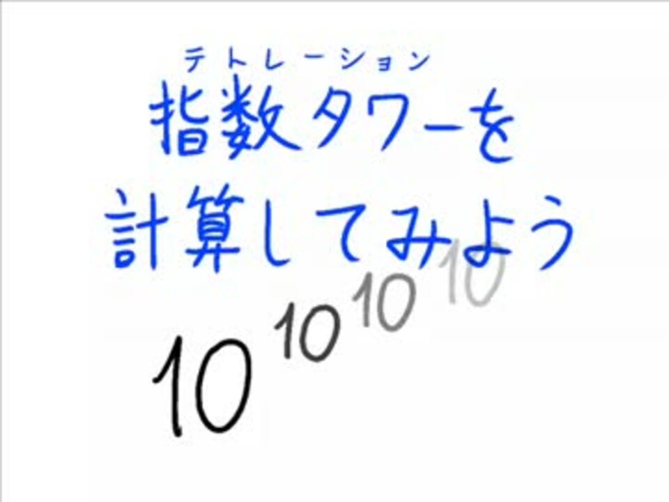 指数が積み重なった数を初めて見たときのインパクトは忘れられないものがあります。今回は、その指数タワーの計算に挑んでみます。<br /><br /> 10進表記が不可能な程巨大なこれらの数ですが、10の指数タワーに変換していくことは、実は可能です。これによって、異なる指数で構成された指数タワーを、比較することができるようになります。<br /> そして、巨大数オーダーにおいては、それを記述する数字に特徴的な振る舞いが見られるようになることも、明らかになりました。<br /><br />BGM:『ゆめにっき』より、「屋上」「火星」<br /><br /><a href="https://www.nicovideo.jp/mylist/35451262" target="_blank" rel="noopener">mylist/35451262</a>